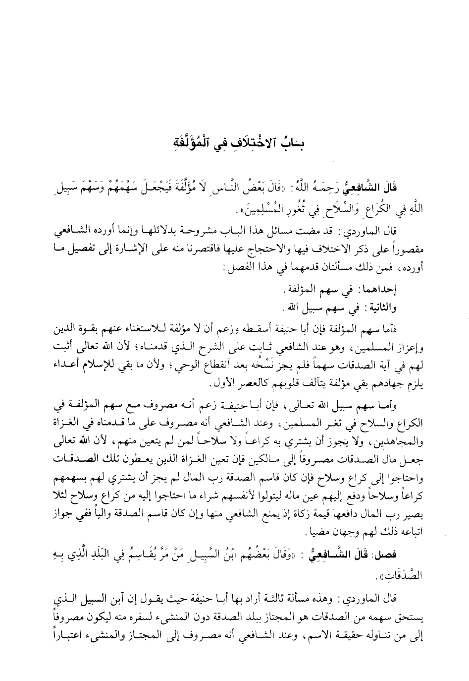 فَأَمَّا سَهْمُ الْمُؤَلَّفَةِ فَإِنَّ أبا حنيفة أَسْقَطَهُ وَزَعَمَ أَنْ لَا مُؤَلَّفَةَ لِلِاسْتِغْنَاءِ عَنْهُمْ بِقُوَّةِ الدِّينِ وَإِعْزَازِ الْمُسْلِمِينَ، وَهُوَ عِنْدَ الشَّافِعِيِّ ثَابِتٌ عَلَى الشَّرْحِ الَّذِي قَدَّمْنَاهُ؛ لِأَنَّ اللَّهَ تَعَالَى أَثْبَتَ لَهُمْ فِي آيَةِ الصَّدَقَاتِ سَهْمًا فَلَمْ يَجُزْ نَسْخُهُ بَعْدَ انْقِطَاعِ الْوَحْيِ؛ وَلِأَنَّ مَا بَقِيَ لِلْإِسْلَامِ أَعْدَاءٌ يَلْزَمُ جِهَادُهُمْ بَقِيَ مُؤَلَّفَةٌ يُتَآلَفُ قُلُوبُهُمْ كَالْعَصْرِ الْأَوَّلِ.