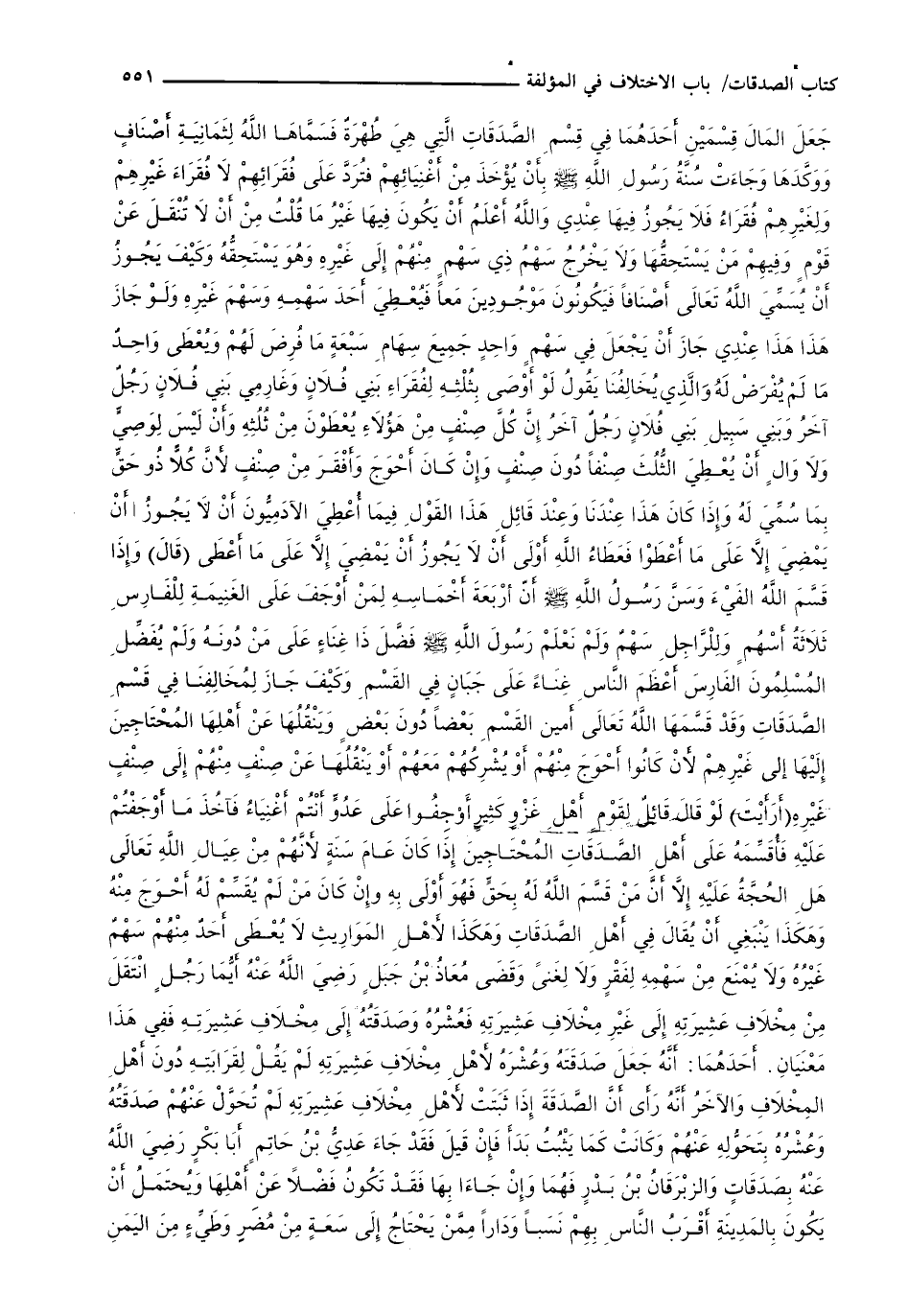 جعل المال قسمين أحدهما في قسم الصدقات التي هي طهرة فسماها الله لثمانية أصناف ووكدها وجاءت سُنَّةُ رَسُولِ اللَّهِ - صَلَّى اللَّهُ عَلَيْهِ وَسَلَّم َ - بأن يؤخذ من أغنيائهم فترد على فقرائهم لا فقراء غيرهم ولغيرهم فقراء فلا يجوز فيها عندي والله أعلم أن يكون فيها غير ما قلت من أن لا تنقل عن قوم وفيهم من يستحقها ولا يخرج سهم ذي سهم منهم إلى غيره وهو يستحقه وكيف يجوز أن يسمي الله تعالى أصنافا فيكونون موجودين معا فيعطي أحد سهمه وسهم غيره ولو جاز هذا هذا عندي جاز أن يجعل في سهم واحد جميع سهام سبعة ما فرض لهم ويعطى واحد ما لم يفرض له والذي يخالفنا يقول لو أوصى بثلثه لفقراء بني فلان وغارمي بني فلان رجل آخر وبني سبيل بني فلان رجلا آخر إن كل صنف من هؤلاء يعطون من ثلثه وأن ليس لوصي ولا وال أن يعطى الثلث صنفا دون صنف وإن كان أحوج وأفقر من صنف لأن كلا ذو حق بما سمي له وإذا كان هذا عندنا وعند قائل هذا القول فيما أعطي الآدميون أن لا يجوز أن يمضي إلا على ما أعطوا فعطاء الله أولى أن لا يجوز أن يمضي إلا على ما أعطى (قال) وإذا قسم الله الفيء وسن رسول الله - صَلَّى اللَّهُ عَلَيْهِ وَسَلَّم َ - أن أربعة أخماسه لمن أوجف على الغنيمة للفارس ثلاثة أسهم وللراجل سهم ولم نعلم رسول الله - صَلَّى اللَّهُ عَلَيْهِ وَسَلَّم َ - فضّل ذا غناء على من دونه ولم يفضل المسلمون الفارس أعظم الناس غناء على جبان في القسم وكيف جاز لمخالفنا في قسم الصدقات وقد قسمها الله تعالى أمين القسْم بعضا دون بعض وينقلها عن أهلها المحتاجين إليها إلى غيرهم لأن كانوا أحوج منهم أو يشركهم معهم أو ينقلها عن صنف منهم إلى صنف غيره (أرأيت) لو قال قائل لقوم أهل غزو كثير أوجفوا على عدو أنتم أغنياء فآخذ ما أوجفتم عليه فأقسمه على أهل الصدقات المحتاجين إذا كان عام سنة لأنهم من عيال الله تعالى هل الحجة عليه إلا أن من قسم الله له بحق فهو أولى به وإن كان من لم يقسم له أحوج منه وهكذا ينبغي أن يقال في أهل الصدقات وهكذا لأهل المواريث لا يعطى أحد منهم سهم غيره ولا يمنع من سهمه لفقر ولا لغنى وقضى معاذ بن جبل رضي الله عنه أَيُّمَا رَجُلٍ انْتَقَلَ مِنْ مِخْلَافِ عَشِيرَتِهِ إِلَى غير مخلاف عشيرته فعشره وصدقته إلى مخلاف عشيرته ففي هذا معنيان. أحدهما: أنه جعل صدقته وعشره لأهل مخلاف عشيرته لم يقل لقرابته دون أهل المخلاف والآخر: أنه رأى أن الصدقة إذا ثبتت لأهل مخلاف عشيرته لم تحول عنهم صدقته وعشره بتحوله عنهم وكانت كما يثبت بدأ فإن قيل فقد جاء عدي بن حاتم أبا بكر رضي الله عنه بصدقات والزبرقان بن بدر فهما وإن جاءا بها فقد تكون فضلا عن أهلها ويحتمل أن يكون بالمدينة أقرب الناس بهم نسبا ودارا ممن يحتاج إلى سعة من مضر وطيّء من اليمن
