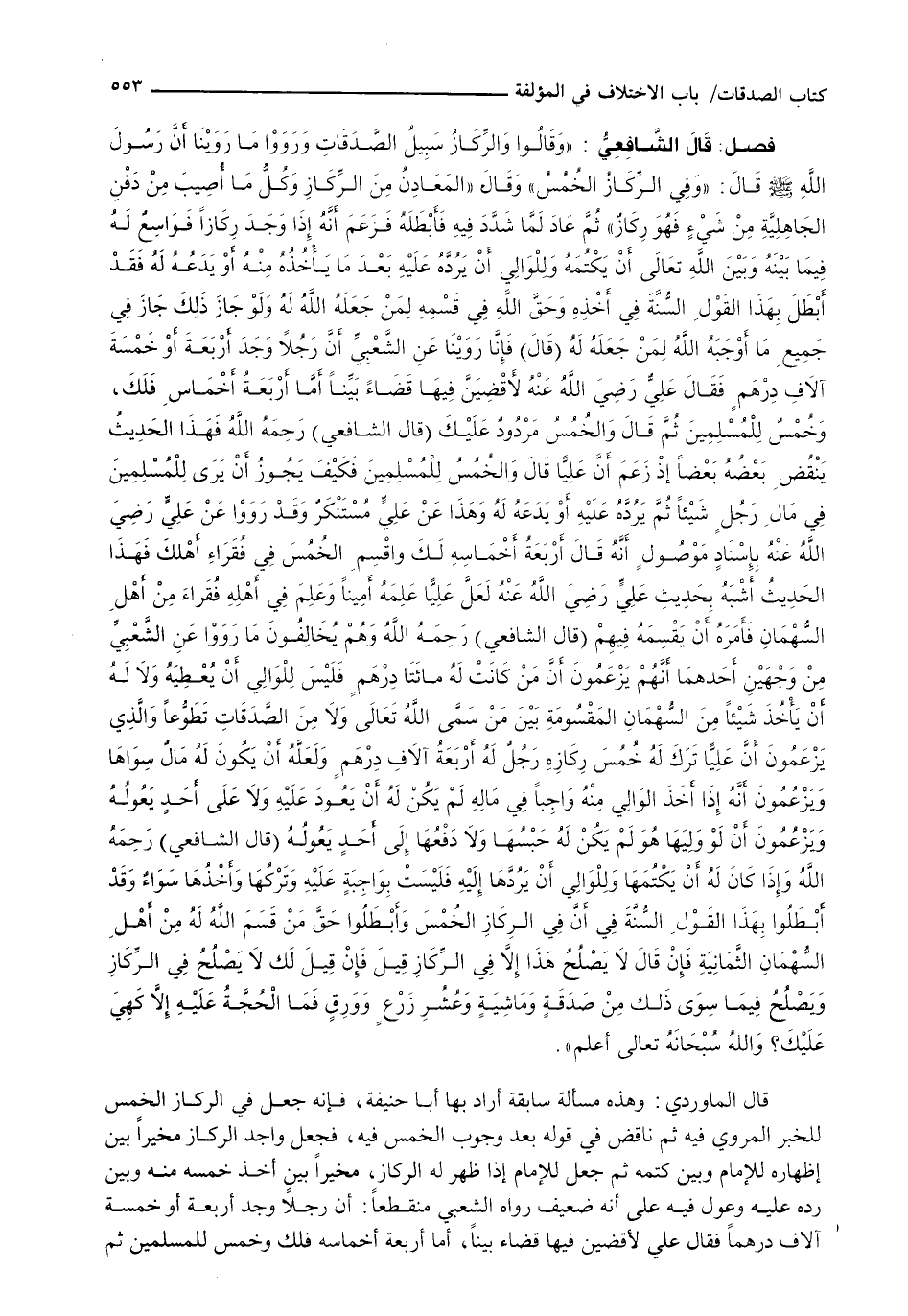 قال الماوردي: وهذه مسألة سابقة أَرَادَ بِهَا أبا حنيفة، فَإِنَّهُ جَعَلَ فِي الرِّكَازِ الْخُمُسَ لِلْخَبَرِ الْمَرْوِيِّ فِيهِ ثُمَّ نَاقَضَ فِي قَوْلِهِ بَعْدَ وُجُوبِ الْخُمُسِ فِيهِ، فَجَعَلَ وَاجِدَ الرَّكَازِ مُخَيَّرًا بَيْنَ إِظْهَارِهِ لِلْإِمَامِ وَبَيْنَ كَتْمِهِ ثُمَّ جَعَلَ لِلْإِمَامِ إِذَا ظَهَرَ لَهُ الرِّكَازُ، مُخَيَّرًا بَيْنَ أَخْذِ خُمُسِهِ مِنْهُ وَبَيْنَ رَدِّهِ عَلَيْهِ وَعَوَّلَ فِيهِ عَلَى أَنَّهُ ضَعِيفٌ رَوَاهُ الشَّعْبِيُّ مُنْقَطِعًا: أَنَّ رَجُلًا وَجَدَ أَرْبَعَةَ أَوْ خَمْسَةَ آلَافِ دِرْهَمٍ فَقَالَ عَلِيٌّ لِأَقْضِيَنَّ فِيهَا قَضَاءً بَيِّنًا، أَمَّا أَرْبَعَةُ أَخْمَاسِهِ فَلَكَ وَخُمُسٌ لِلْمُسْلِمِينَ ثُمَّ