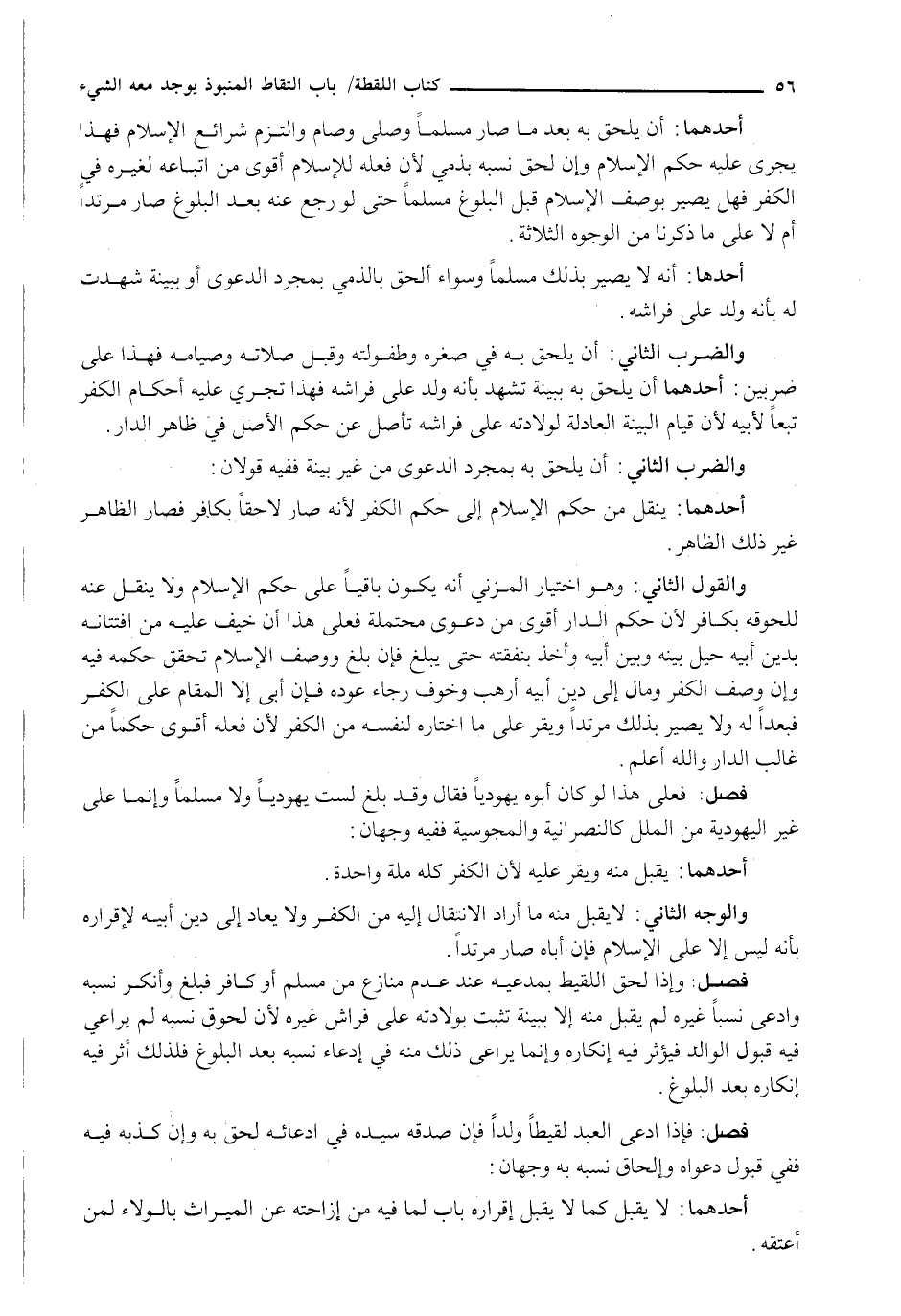 أَحَدُهُمَا: أَنْ يَلْحَقَ بِهِ بَعْدَ مَا صَارَ مُسْلِمًا وَصَلَّى وَصَامَ وَالْتَزَمَ شَرَائِعَ الْإِسْلَامِ فَهَذَا يَجْرِي عَلَيْهِ حُكْمُ الْإِسْلَامِ وَإِنْ لَحِقَ نَسَبُهُ بِذِمِّيٍّ لِأَنَّ فِعْلَهُ لِلْإِسْلَامِ أَقْوَى مِنِ اتِّبَاعِهِ لِغَيْرِهِ فِي الْكُفْرِ فَهَلْ يَصِيرُ بِوَصْفِ الْإِسْلَامِ قَبْلَ الْبُلُوغِ مُسْلِمًا حَتَّى لَوْ رَجَعَ عَنْهُ بَعْدَ الْبُلُوغِ صَارَ مُرْتَدًّا أَمْ لَا عَلَى مَا ذَكَرْنَا مِنَ الْوُجُوهِ الثَّلَاثَةِ.