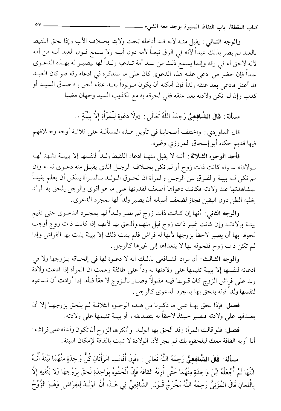وَالْوَجْهُ الثَّالِثُ: أَنَّ مُرَادَ الشَّافِعِيِّ بِذَلِكَ أَنَّهُ لَا دَعْوَةَ لَهَا فِي إِلْحَاقِهِ بِزَوْجِهَا وَلَا فِي ادِّعَائِهِ لِنَفْسِهَا إِلَّا بِبَيِّنَةٍ تُقِيمُهَا عَلَى وِلَادَتِهَا لَهُ رَدًّا عَلَى طَائِفَةٍ زَعَمَتْ أَنَّ الْمَرْأَةَ إِذَا ادَّعَتْ وِلَادَةَ وَلَدٍ عَلَى فِرَاشِ الزَّوْجِ كَانَ قَوْلُهَا فِيهِ مَقْبُولًا وَصَارَ بِالزَّوْجِ لَاحِقًا فَأَمَّا إِذَا أَرَادَتْ أَنْ تَدْعُوَهُ لِنَفْسِهَا وَلَدًا فَإِنَّهُ يَلْحَقُ بِهَا بِمُجَرَّدِ الدَّعْوَى كَالرَّجُلِ.