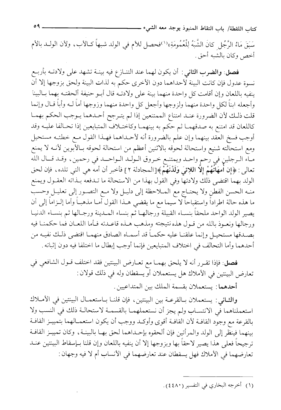 وَالضَّرْبُ الثَّانِي: أَنْ يَكُونَ لَهُمَا عِنْدَ التَّنَازُعِ فِيهِ بَيِّنَةٌ تَشْهَدُ عَلَى وِلَادَتِهِ بِأَرْبَعِ نِسْوَةٍ عُدُولٍ فَإِنْ كَانَتِ الْبَيِّنَةُ لِإِحْدَاهُمَا دُونَ الْأُخْرَى حُكِمَ بِهِ لِذَاتِ الْبَيِّنَةِ وَلَحِقَ بِزَوْجِهَا إِلَّا أَنْ يَنْفِيَهُ بِاللِّعَانِ وَإِنْ أَقَامَتْ كُلُّ وَاحِدَةٍ مِنْهُمَا بَيِّنَةً عَلَى وِلَادَتِهِ قَالَ أبو حنيفة أَلْحَقْتُهُ بِهِمَا بِالْبَيِّنَةِ وَأَجْعَلُهُ ابْنًا لِكُلِّ وَاحِدَةٍ مِنْهُمَا وَلِزَوْجِهَا وَأَجْعَلُ كُلَّ وَاحِدَةٍ مِنْهُمَا وَزَوْجَهَا أَمَّا لَهُ وَأَبًا قَالَ وَإِنَّمَا قُلْتُ ذَلِكَ لِأَنَّ الضَّرُورَةَ عِنْدَ امْتِنَاعِ الْمُمْتَنِعِينَ إِذَا لَمْ يَتَرَجَّحْ أَحَدُهُمَا يُوجِبُ الْحُكْمَ بِهِمَا كَاللِّعَانِ قَدِ امْتَنَعَ بِهِ صِدْقُهُمَا ثُمَّ حُكِمَ بِهِ بَيْنَهُمَا وَكَاخْتِلَافِ المتبايعين إذا تحالفا عليه وقد أَوْجَبَ فَسْخَ الْعَقْدِ بَيْنَهُمَا وَإِنْ عُلِمَ بِالضَّرُورَةِ أنه لأحداهما فَهَذَا الْقَوْلُ مَعَ خَطَئِهِ مُسْتَحِيلٌ وَمَعَ اسْتِحَالَتِهِ شَنِيعٌ وَاسْتِحَالَةُ لُحُوقِهِ بِالِاثْنَيْنِ أَعْظَمُ مِنِ اسْتِحَالَةِ لحوقه بالأبوين لأنه لا يمنع ماء الرجلين في رحم واحد ويمتنع خروق الْوَلَدِ الْوَاحِدِ فِي رَحِمَيْنِ، وَقَدْ قَالَ اللَّهُ تَعَالَى: {إِنْ أُمَّهَاتُهُمْ إِلا اللائِي وَلَدْنَهُمْ} [المجادلة: 2] فَأَخْبَرَ أَنَّ أُمَّهُ هِيَ الَّتِي تَلِدُهُ، فَإِنْ لَحِقَ الْوَلَدُ بِهِمَا اقْتَضَى ذَلِكَ وِلَادَتَهَا وَفِي الْقَوْلِ بِهَذَا مِنَ الِاسْتِحَالَةِ مَا تَدْفَعُهُ بِذَاتِهِ العقول ويمنع منه الحسن الفطن وَلَا يَحْتَاجُ مَعَ الْمُلَاحَظَةِ إِلَى دَلِيلٍ وَلَا مَعَ التَّصَوُّرِ إِلَى تَعْلِيلٍ وَحَسْبُ مَا هَذِهِ حالة اطرادا واستقباحا لا سيما مع ما يَقْضِي هَذَا الْقَوْلُ إِمَّا مَذْهَبًا وَإِمَّا إِلْزَامًا إِلَى أَنْ يَصِيرَ الْوَلَدُ الْوَاحِدُ مُلْحَقًا بِنِسَاءِ الْقَبِيلَةِ وَرِجَالِهَا ثُمَّ بِنِسَاءِ الْمَدِينَةِ وَرِجَالِهَا ثُمَّ بِنِسَاءِ الدُّنْيَا وَرِجَالِهَا وَنَعُوذُ بِاللَّهِ مِنْ قَوْلٍ هَذِهِ نَتِيجَتُهُ وَمَذْهَبٍ هَذِهِ قَاعِدَتُهُ فَأَمَّا اللِّعَانُ فما حكمنا فيه بصدقها مُسْتَحِيلٌ وَإِنَّمَا عَلَّقْنَا عَلَيْهِ حُكْمًا قَدْ أَسْمَاهُ الصَّادِقُ مِنْهُمَا اقْتَضَى ذَلِكَ نَفْيَهُ مِنْ أَحَدِهِمَا وَأَمَّا التَّحَالُفُ فِي اخْتِلَافِ الْمُتَبَايِعِينَ فَإِنَّمَا أَوْجَبَ إِبْطَالُ مَا اخْتَلَفَا فِيهِ دُونَ إِثْبَاتِهِ.
