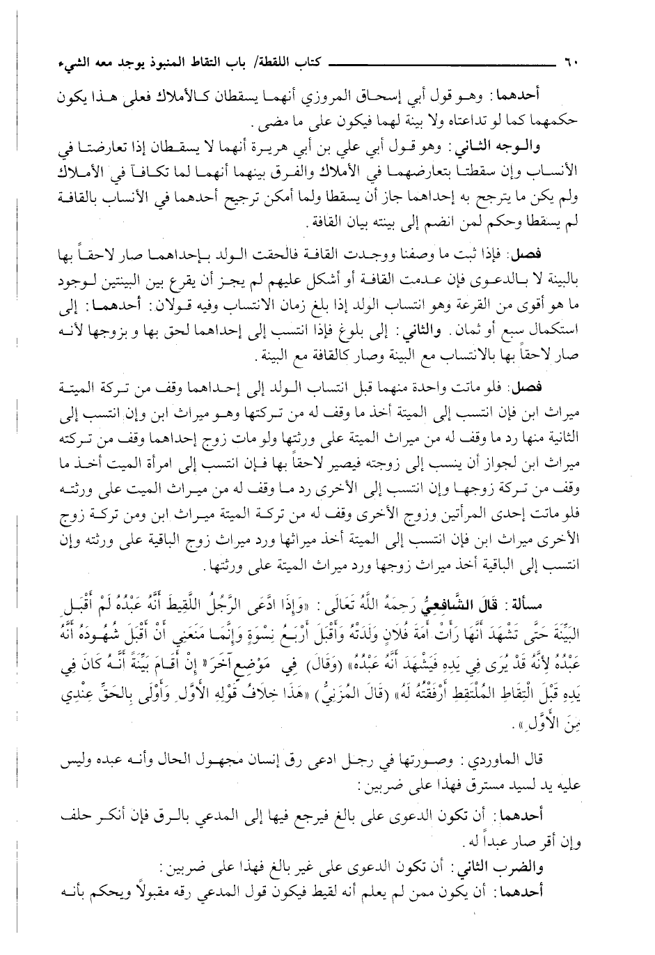 وَالْوَجْهُ الثَّانِي: وَهُوَ قَوْلُ أَبِي عَلِيِّ بْنِ أَبِي هُرَيْرَةَ إِنَّهُمَا لَا يَسْقُطَانِ إِذَا تَعَارَضَتَا فِي الْأَنْسَابِ وَإِنْ سَقَطَتَا بِتَعَارُضِهِمَا فِي الْأَمْلَاكِ وَالْفَرْقِ بَيْنَهُمَا أَنَّهُمَا لَمَّا تَكَافَآ في الأملاك ولم يكن ما يترجح بِهِ إِحْدَاهُمَا جَازَ أَنْ يَسْقُطَا وَلَمَا أَمْكَنَ تَرْجِيحُ أَحَدِهِمَا فِي الْأَنْسَابِ بِالْقَافَةِ لَمْ يَسْقُطَا وَحُكِمَ لِمَنِ انْضَمَّ إِلَى بَيِّنَتِهِ بَيَانُ الْقَافَةِ.