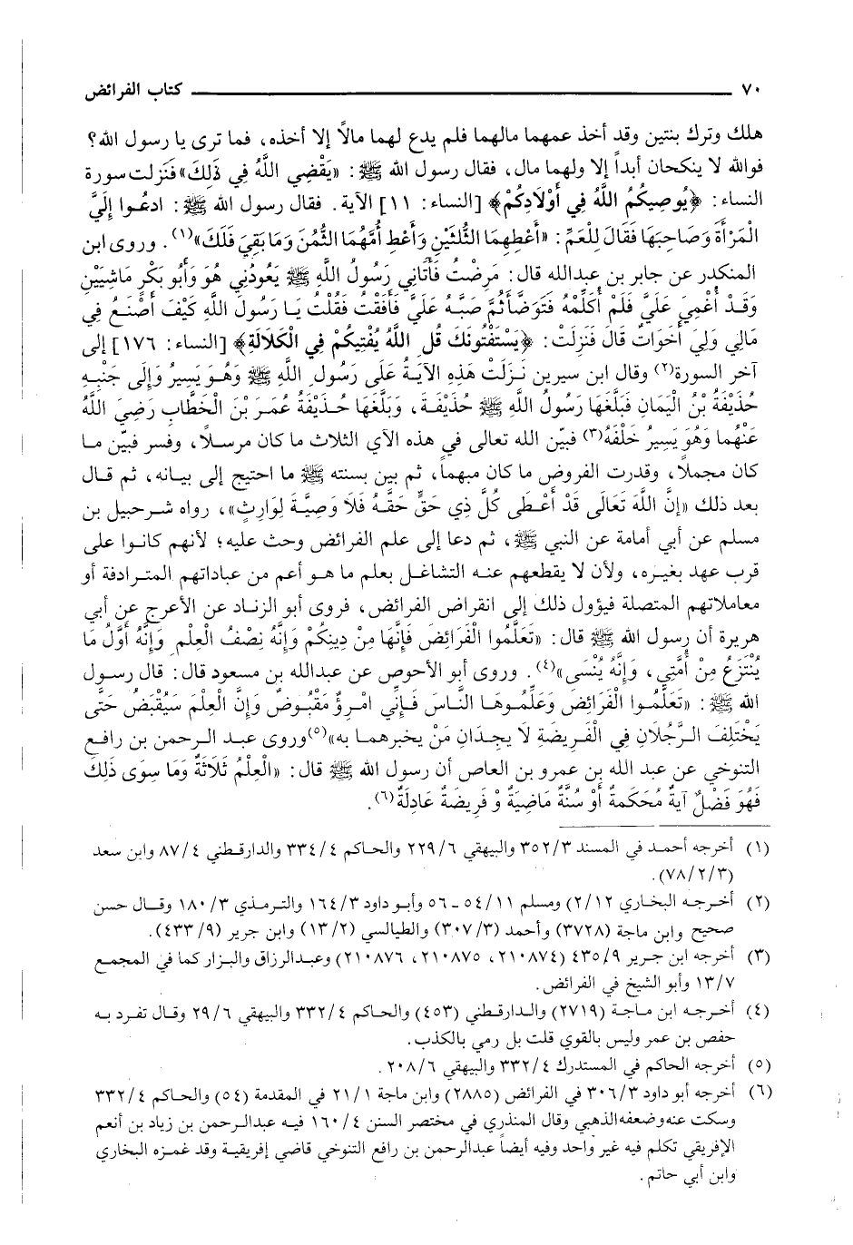 هَلَكَ وَتَرَكَ بِنْتَيْنِ وَقَدْ أَخَذَ عَمُّهُمَا مَالَهُمَا فَلَمْ يَدَعْ لَهُمَا مَالًا إِلَّا أَخَذَهُ، فَمَا ترى يا رسول الله؟ فوالله لا يَنْكِحَانِ أَبَدًا إِلَّا وَلَهُمَا مَالٌ، فَقَالَ رَسُولُ اللَّهِ - صَلَّى اللَّهُ عَلَيْهِ وَسَلَّم َ -: " يَقْضِي اللَّهُ فِي ذَلِكَ " فَنَزَلَتْ سُورَةُ النِّسَاءِ: {يُوصِيكُمُ اللَّهُ فِي أَوْلادِكُمْ} [النساء: 11] الْآيَةِ. فَقَالَ رَسُولَ اللَّهِ - صَلَّى اللَّهُ عَلَيْهِ وَسَلَّم َ -: ادعوا إلي الْمَرْأَةَ وَصَاحِبَهَا فَقَالَ لِلْعَمِّ: " أعْطِهِمَا الثُّلْثَيْنِ وَأَعْطِ أُمَّهُمَا الثُّمُنَ وَمَا بَقِيَ فَلَكَ ". وَرَوَى ابْنُ الْمُنْكَدِرِ عَنْ جَابِرِ بْنِ عَبْدِ اللَّهِ قَالَ: مَرِضْتُ فَأَتَانِي رَسُولُ اللَّهِ - صَلَّى اللَّهُ عَلَيْهِ وَسَلَّم َ - يَعُودُنِي هُوَ وَأَبُو بَكْرٍ مَاشِيَيْنِ وَقَدْ أُغْمِيَ عَلَيَّ فَلَمْ أُكَلِّمْهُ فَتَوَضَّأَ ثُمَّ صَبَّهُ عَلَيَّ فَأَفَقْتُ فَقُلْتُ يَا رَسُولَ اللَّهِ كَيْفَ أَصْنَعُ فِي مَالِي وَلِي أَخَوَاتٌ قَالَ فَنَزَلَتْ: {يَسْتَفْتُونَكَ قُلِ اللَّهُ يُفْتِيكُمْ فِي الْكَلالَةِ} [النساء: 176] إِلَى آخر السورة وقال ابْنُ سِيرِينَ نَزَلَتْ هَذِهِ الْآيَةُ عَلَى رَسُولِ اللَّهِ - صَلَّى اللَّهُ عَلَيْهِ وَسَلَّم َ - وَهُوَ يَسِيرُ وَإِلَى جَنْبِهِ حُذَيْفَةُ بْنُ الْيَمَانِ فَبَلَغَهَا رَسُول اللَّهِ - صَلَّى اللَّهُ عَلَيْهِ وَسَلَّم َ - حُذَيْفَة، وَبَلَغَهَا حُذَيْفَةُ عُمَرَ بْنَ الْخَطَّابِ رَضِيَ اللَّهُ عَنْهُمَا وَهُوَ يَسِيرُ خَلْفَهُ فَبَيَّنَ اللَّهُ تَعَالَى فِي هَذِهِ الْآيِ الثَّلَاثِ مَا كَانَ مرسلا، وفسر فبين مَا كَانَ مُجْمَلًا، وَقَدَّرَتِ الْفُرُوضُ مَا كَانَ مُبْهَمًا، ثُمَّ بَيَّنَ بِسُنَّتِهِ - صَلَّى اللَّهُ عَلَيْهِ وَسَلَّم َ - مَا احْتِيجَ إِلَى بَيَانِهِ، ثُمَّ قَالَ بَعْدَ ذلك " إِنَّ اللَّهَ تَعَالَى قَدْ أَعْطَى كُلَّ ذِي حَقٍّ حَقَّهِ فَلَا وَصِيَّةَ لِوَارِثٍ "، رَوَاهُ شُرَحْبِيل بن مسلم عَنْ أَبِي أُمَامَةَ عَنِ النَّبِيِّ - صَلَّى اللَّهُ عَلَيْهِ وَسَلَّم َ -، ثُمَّ دَعَا إِلَى عِلْمِ الْفَرَائِضِ وَحَثَّ عَلَيْهِ؛ لأنهم كانوا على قرب عهد بغيره، ولأن لا يقطعهم عنه التَّشَاغُلُ بِعِلْمِ مَا هُوَ أَعَمُّ مِنْ عِبَادَاتِهِمُ الْمُتَرَادِفَةِ أَوْ مُعَامَلَاتِهِمُ الْمُتَّصِلَةِ فَيَؤولُ ذَلِكَ إِلَى انْقِرَاضِ الْفَرَائِضِ، فَرَوَى أَبُو الزِّنَادِ عَنِ الْأَعْرَجِ عَنْ أَبِي هُرَيْرَةَ أَنَّ رَسُولَ اللَّهِ - صَلَّى اللَّهُ عَلَيْهِ وَسَلَّم َ - قَالَ: " تَعَلَّمُوا الْفَرَائِضَ فَإِنَّهَا مِنْ دِينِكُمْ وَإِنَهُ نِصْفُ الْعِلْمِ وَإِنَّهُ أَوَّلُ مَا يُنْتَزَعُ مِنْ أُمَّتِي، وَإِنَّهُ يُنْسَى ". وَرَوَى أَبُو الْأَحْوَصِ عنْ عَبْدِ اللَّهِ بْنِ مَسْعُودٍ قَالَ: قَالَ رَسُولُ اللَّهِ - صَلَّى اللَّهُ عَلَيْهِ وَسَلَّم َ -: " تَعَلَّمُوا الْفَرَائِضَ وَعَلِّمُوهَا النَّاسَ فَإِنِّي امْرُؤٌ مَقْبُوضٌ وَإِنَّ الْعِلْمَ سَيُقْبَضُ حَتَّى يَخْتَلِفَ الرَّجُلَانِ فِي الْفَرِيضَةِ لَا يَجِدَانِ مَنْ يُخْبِرُهُمَا بِهِ " وَرَوَى عَبْدُ الرَّحْمَنِ بْنُ رَافِعٍ التَّنُوخِيُّ عَنْ عَبْدِ اللَّهِ بْنِ عَمْرِو بْنِ الْعَاصِ أَنَّ رَسُولَ اللَّهِ - صَلَّى اللَّهُ عَلَيْهِ وَسَلَّم َ - قَالَ: " الْعِلْمُ ثَلَاثَةٌ وَمَا سِوَى ذَلِكَ فَهُوَ فضل آية محكمة أو سنة ماضية وفريضة عادلة ".