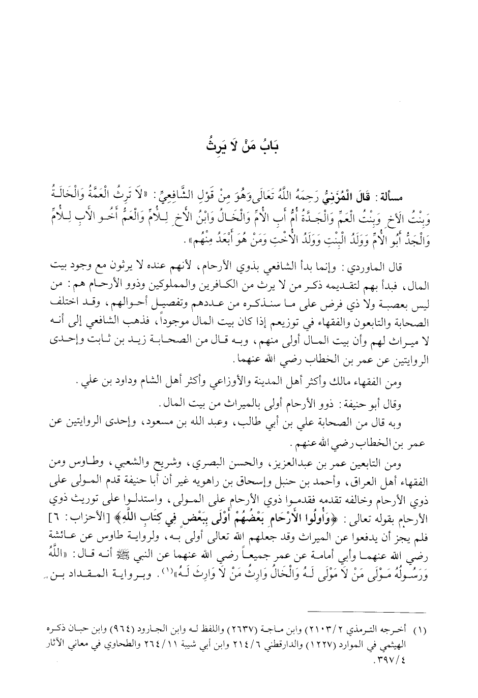 قَالَ الْمَاوَرْدِيُّ: وَإِنَّمَا بَدَأَ الشَّافِعِيُّ بِذَوِي الْأَرْحَامِ، لِأَنَّهُمْ عِنْدَهُ لَا يَرِثُونَ مَعَ وُجُودِ بَيْتِ الْمَالِ، فَبَدَأَ بِهِمْ لِتَقْدِيمِهِ ذِكْرَ مَنْ لَا يَرِثُ مِنَ الْكَافِرِينَ والمملوكين وذوو الأرحام هم: من ليس بعصبة ولا ذي فَرْضٍ عَلَى مَا سَنَذْكُرُهُ مِنْ عَدَدِهِمْ وَتَفْصِيلِ أَحْوَالِهِمْ، وَقَدِ اخْتَلَفَ الصَّحَابَةُ وَالتَّابِعُونَ وَالْفُقَهَاءُ فِي توزيعهم إِذَا كَانَ بَيْتُ الْمَالِ مَوْجُودًا، فَذَهَبَ الشَّافِعِيُّ إلى أنه لَا مِيرَاثَ لَهُمْ وَأَنَّ بَيْتَ الْمَالِ أَوْلَى مِنْهُمْ، وَبِهِ قَالَ مِنَ الصَّحَابَةِ زَيْدُ بْنُ ثَابِتٍ وَإِحْدَى الرِّوَايَتَيْنِ عَنْ عُمَرَ بْنِ الْخَطَّابِ رَضِيَ اللَّهُ عَنْهُمَا.