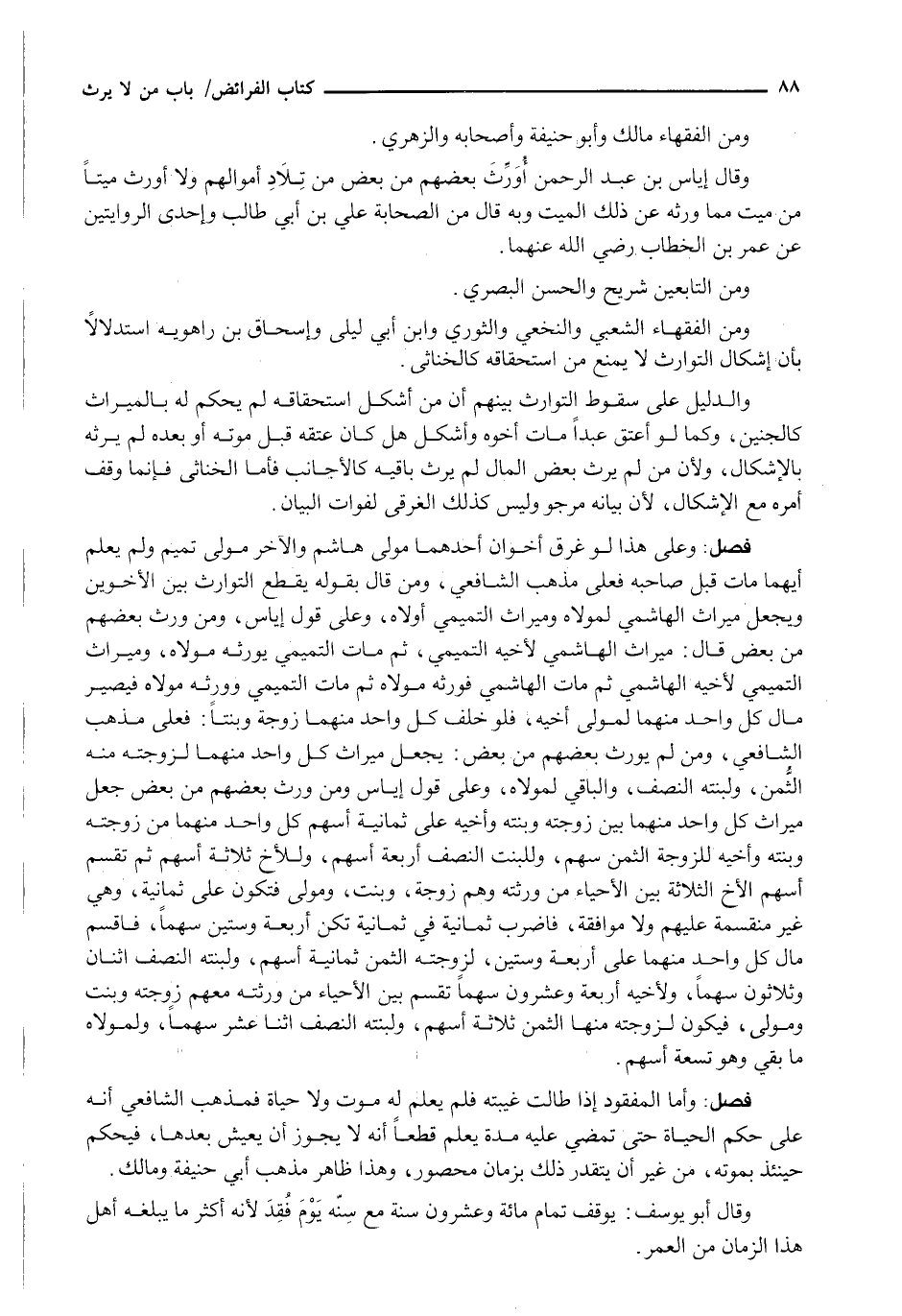 وَعَلَى هَذَا لَوْ غَرِقَ أَخَوَانِ أَحَدهُمَا مَوْلَى هَاشِمٍ وَالْآخَرُ مَوْلَى تَمِيمٍ وَلَمْ يُعْلَمْ أَيُّهُمَا مَاتَ قَبْلَ صَاحِبِهِ فَعَلَى مَذْهَبِ الشَّافِعِيِّ، وَمَنْ قَالَ بِقَوْلِهِ يُقْطَعُ التَّوَارُثُ بَيْنَ الْأَخَوَيْنِ وَيُجْعَلُ ميراث الهاشمي لمولاه وميراث التميمي أولاه، وَعَلَى قَوْلِ إِيَاسٍ، وَمَنْ وَرَّثَ بَعْضَهُمْ مِنْ بَعْضٍ قَالَ: مِيرَاثُ الْهَاشِمِيِّ لِأَخِيهِ التَّمِيمِيِّ، ثُمَّ مات التميمي يورثه مولاه، وَمِيرَاثُ التَّمِيمِيِّ لِأَخِيهِ الْهَاشِمِيِّ ثُمَّ مَاتَ الْهَاشِمِيُّ فورثه مولاه ثم مات التميمي وورثه مَوْلَاهُ فَيَصِيرُ مَالُ كُلِّ وَاحِدٍ مِنْهُمَا لِمَوْلَى أَخِيهِ، فَلَوْ خَلَّفَ كُلُّ وَاحِدٍ مِنْهُمَا زَوْجَةً وَبِنْتًا: فَعَلَى مَذْهَبِ الشَّافِعِيِّ، وَمَنْ لَمْ يُوَرِّثْ بَعْضَهُمْ مِنْ بَعْضٍ: يَجْعَلُ مِيرَاثَ كُلِّ وَاحِدٍ مِنْهُمَا لِزَوْجَتِهِ مِنْهُ الثُّمُنَ، وَلَبِنَتِهِ النِّصْفَ، وَالْبَاقِي لِمَوْلَاهُ، وَعَلَى قَوْلِ إِيَاسٍ وَمَنْ وَرَّثَ بَعْضَهُمْ مِنْ بَعْضٍ جَعَلَ مِيرَاثَ كُلِّ وَاحِدٍ مِنْهُمَا بَيْنَ زَوْجَتِهِ وَبِنْتِهِ وَأَخِيهِ عَلَى ثَمَانِيَةِ أَسْهُمٍ كل واحد منهما من زوجته وبنته وأخيه لِلزَّوْجَةِ الثُّمُنُ سَهْمٌ، وَلِلْبِنْتِ النِّصْفُ أَرْبَعَةُ أَسْهُمٍ، وللأخ ثلاثة أسهم ثم تقسم أَسْهُمُ الْأَخِ الثَّلَاثَة بَيْنَ الْأَحْيَاءِ مِنْ وَرَثَتِهِ وَهُمْ زَوْجَةٌ، وَبِنْتٌ، وَمَوْلَى فَتَكُونُ عَلَى ثَمَانِيَةٍ، وهي غير منقسمة عليهم وَلَا مُوَافِقَةٍ، فَاضْرِبْ ثَمَانِيَةً فِي ثَمَانِيَةٍ تَكُنْ أَرْبَعَةً وَسِتِّينَ سَهْمًا، فَاقْسِمْ مَالَ كُلِّ وَاحِدٍ منهما على أربعة وستين، لزوجته ثمن ثَمَانِيَةُ أَسْهُمٍ، وَلِبِنْتِهِ النِّصْفُ اثْنَانِ وَثَلَاثُونَ سَهْمًا، وَلِأَخِيهِ أَرْبَعَةٌ وَعِشْرُونَ سَهْمًا تُقَسَّمُ بَيْنَ الْأَحْيَاءِ من ورثته معهم زوجته وَبِنْتٌ وَمَوْلَى، فَيَكُونُ لِزَوْجَتِهِ مِنْهَا الثُّمُنُ ثَلَاثَةُ أَسْهُمٍ، وَلَبِنَتِهِ النِّصْفُ اثْنَا عَشَرَ سَهْمًا، وَلِمَوْلَاهُ مَا بَقِيَ وَهُوَ تِسْعَةُ أَسْهُمٍ.