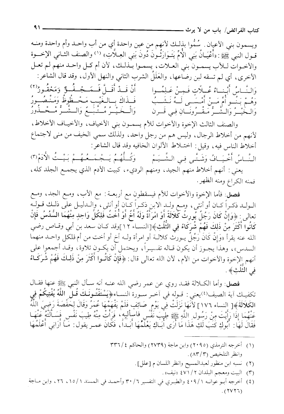 وَيُسَمُّونَ بَنِي الْأَعْيَانِ. سُمُّوا بِذَلِكَ لِأَنَّهُمْ مِنْ عَيْنٍ وَاحِدَةٍ أَيْ مِنْ أَبٍ وَاحِدٍ وَأُمٍّ وَاحِدَةٍ وَمِنْهُ قَوْلُ النَّبِيِّ - صَلَّى اللَّهُ عَلَيْهِ وَسَلَّم َ -: " أعيان بني الأم يتوارثون دون بني العلات " وَالصِّنْفُ الثَّانِي الْإِخْوَةُ وَالْأَخَوَاتُ لِلْأَبِ يُسَمُّونَ بَنِي العلات، يسموا بِذَلِكَ، لِأَنَّ أُمَّ كُلِّ وَاحِدٍ مِنْهُمْ لَمْ تعِلَّ الْأُخْرَى، أَيْ لَمْ تسْقِهِ لَبَنَ رَضَاعِهَا، وَالْعَلَلُ الشُّرْبُ الثَّانِي وَالنَّهَلُ الْأَوَّلُ، وَقَدْ قَالَ الشاعر