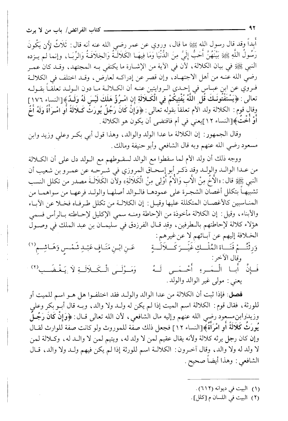 وَوَجْهُ ذَلِكَ أَنَّ ولد الأم لما سقطوا مع الوالد لسقوطهم مَعَ الْوَلَدِ دَلَّ عَلَى أَنَّ الْكَلَالَةَ مَنْ عدا الوالد والولد وَقَدْ ذَكَرَ أَبُو إِسْحَاقَ الْمَرْوَزِيُّ فِي شَرْحِهِ عن عمرو ابن شُعَيْبٍ أَنَّ النَّبِيَّ - صَلَّى اللَّهُ عَلَيْهِ وَسَلَّم َ - قَالَ: " الْأَخُ مِنَ الْأَبِ وَالْأُمِّ أَوْلَى مِنَ الْكَلَالَةِ " وَلِأَنَّ الْكَلَالَةَ مَصْدَرٌ مِنْ تَكَلّلَ النَّسَب تَشبيهًا بِتَكَلُّلِ أَغْصَانِ الشَّجَرَةِ عَلَى عَمُودِهَا فَالْوَالِدُ أصلها والولد فرعها من سِوَاهُمَا مِنَ الْمُنَاسِبِينَ كَالْأَغْصَانِ الْمُتَكَلِّلَةِ عَلَيْهَا وَقِيلَ: إِنَّ الْكَلَالَةَ منْ تَكَلَّلَ طَرَفَاهُ فَخَلَا عَنِ الْآبَاءِ وَالْأَبْنَاءِ، وَقِيلَ إِنَّ الْكَلَالَةَ مَأْخُوذَةٌ مِنَ الْإِحَاطَةِ وَمِنْهُ سُمِّيَ الْإِكْلِيلُ لِإِحَاطَتِهِ بِالرَّأْسِ فَسُمِّيَ هَؤُلَاءِ كَلَالَةً لِإِحَاطَتِهِمْ بِالطَّرَفَيْنِ، وَقَدْ قَالَ الْفَرَزْدَقُ فِي سُلَيْمَانَ بْنِ عَبْدِ الْمَلِكِ فِي وُصُولِ الْخِلَافَةِ إِلَيْهِمْ عَنْ آبَائِهِمْ لَا عَنْ غَيْرِهِمْ: