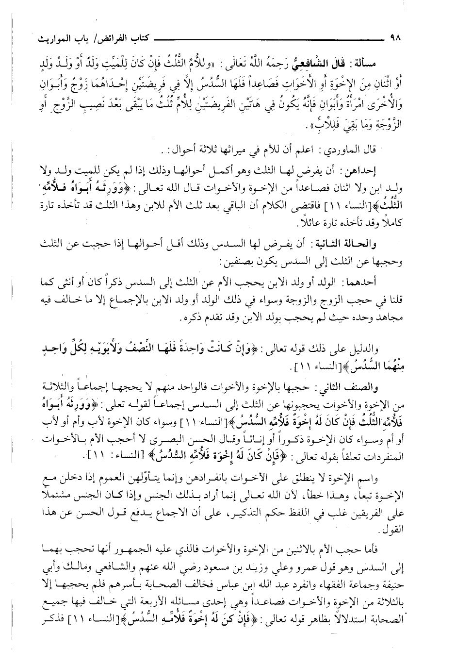 قال الشافعي رحمه الله تعالى: " وَلِلْأُمِّ الثُّلُثُ فَإِنْ كَانَ لِلْمَيِّتِ وَلَدٌ أَوْ وَلَدُ وَلَدٍ أَوِ اثْنَانِ مِنَ الْإِخْوَةِ أَوِ الْأَخَوَاتِ فَصَاعِدًا فَلَهَا السُّدُسُ إِلَّا فِي فَرِيضَتَيْنِ إِحْدَاهُمَا زَوْجٌ وَأَبَوَانِ وَالْأُخْرَى امْرَأَةٌ وَأَبَوَانِ فَإِنَّهُ يَكُونُ فِي هَاتَيْنِ الْفَرِيضَتَيْنِ لِلْأُمِّ ثُلُثُ مَا يَبْقَى بَعْدَ نَصِيبِ الزَّوْجِ أَوِ الزَّوْجَةِ وَمَا بَقِيَ فَلِلْأَبِ ".
