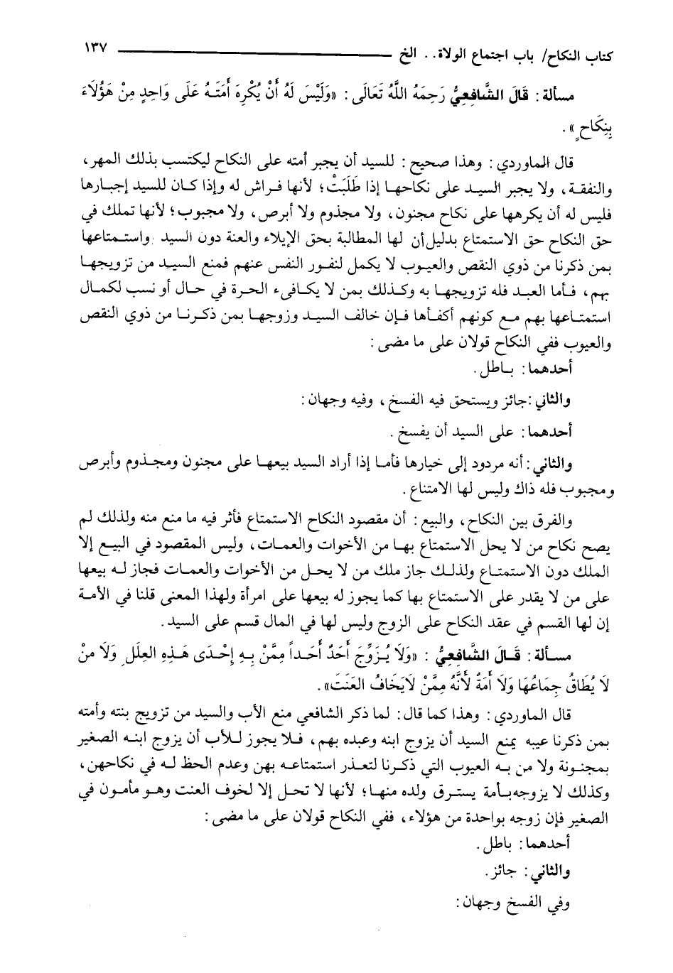 قَالَ الْمَاوَرْدِيُّ: وَهَذَا صَحِيحٌ: لِلسَّيِّدِ أَنْ يُجْبِرَ أَمَتَهُ عَلَى النِّكَاحِ لِيَكْتَسِبَ بِذَلِكَ الْمَهْرَ، وَالنَّفَقَةَ، وَلَا يُجْبَرُ السَّيِّدُ عَلَى نِكَاحِهَا إِذَا طَلَبَتْ؛ لِأَنَّهَا فِرَاشٌ لَهُ وَإِذَا كَانَ لِلسَّيِّدِ إِجْبَارُهَا فَلَيْسَ لَهُ أَنْ يُكْرِهَهَا عَلَى نِكَاحِ مَجْنُونٍ، وَلَا مَجْذُومٍ وَلَا أَبْرَصَ، وَلَا مَجْبُوبٍ؛ لِأَنَّهَا تَمْلِكُ فِي حَقِّ النِّكَاحِ حق الِاسْتِمْتَاعِ بِدَلِيلِ أَنَّ لَهَا الْمُطَالَبَةَ بِحَقِّ الْإِيلَاءِ وَالْعُنَّةِ دُونَ السَّيِّدِ، وَاسْتِمْتَاعُهَا بِمَنْ ذَكَرْنَا مِنْ ذَوِي النَّقْصِ وَالْعُيُوبِ لَا يَكْمُلُ لِنُفُورِ النَّفْسِ عَنْهُمْ فَمُنِعَ السَّيِّدُ مِنْ تَزْوِيجِهَا بِهِمْ، فَأَمَّا الْعَبْدُ فَلَهُ تَزْوِيجُهَا بِهِ وَكَذَلِكَ بِمَنْ لَا يُكَافِئُ الْحُرَّةَ فِي حَالٍ أَوْ نَسَبٍ لِكَمَالِ استمتاعها بهم مع كونهم أكفأها فَإِنْ خَالَفَ السَّيِّدُ وَزَوَّجَهَا بِمَنْ ذَكَرْنَا مِنْ ذَوِي النَّقْصِ وَالْعُيُوبِ فَفِي النِّكَاحِ قَوْلَانِ عَلَى مَا مَضَى:
