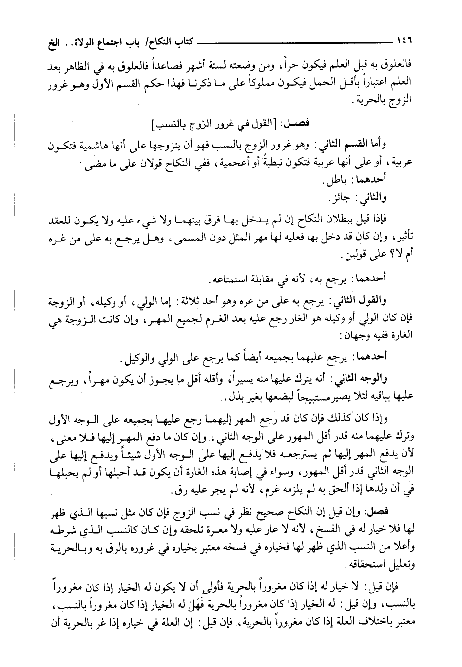 وَأَمَّا الْقِسْمُ الثَّانِي: وَهُوَ غَرُورُ الزَّوْجِ بِالنَّسَبِ فَهُوَ أَنْ يَتَزَوَّجَهَا عَلَى أَنَّهَا هَاشِمِيَّةٌ فَتَكُونُ عَرَبِيَّةً، أَوْ عَلَى أَنَّهَا عَرَبِيَّةٌ فَتَكُونُ نَبَطِيَّةً أَوْ أَعْجَمِيَّةً، فَفِي النِّكَاحِ قَوْلَانِ عَلَى مَا مَضَى: