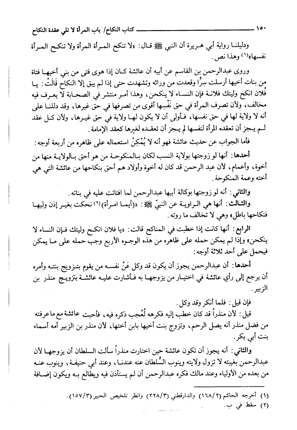 وَرَوَى عَبْدُ الرَّحْمَنِ بن القاسم عن أبيه أن عائشة كَانَ إِذَا هَوَى فَتًى مِنْ بَنِي أَخِيهَا فتاة من بنات أخيها أرسلت سراً وَقَعَدَتْ مِنْ وَرَائِهِ وَتَشَهَّدَتْ حَتَّى إِذَا لَمْ يَبْقَ إِلَّا النِّكَاحُ قَالَتْ: يَا فُلَانُ أنْكِحْ وَلِيَّتَكَ فُلَانَةً فَإِنَّ النِّسَاءَ لَا يَنْكِحْنَ، وَهَذَا أمر مُنْتَشِرٌ فِي الصَّحَابَةِ لَا يُعْرَفُ فِيهِ مُخَالِفٌ، وَلِأَنَّ تَصَرُّفَ الْمَرْأَةِ فِي حَقِّ نَفْسِهَا أَقْوَى مِنْ تَصَرُّفِهَا فِي حَقِّ غَيْرِهَا، وَقَدْ دَلَّلْنَا عَلَى أَنَّهُ لَا وِلَايَةَ لَهَا فِي حَقِّ نَفْسِهَا، فَأَوْلَى أَنْ لَا يَكُونَ لَهَا وِلَايَةٌ فِي حَقِّ غَيْرِهَا، وَلِأَنَّ كُلَّ عَقْدٍ لَمْ يَجُزْ أَنْ تَعْقِدَهُ الْمَرْأَةُ لِنَفْسِهَا لَمْ يَجُزْ أن تعقده لغيرها كعقد الإمامة.