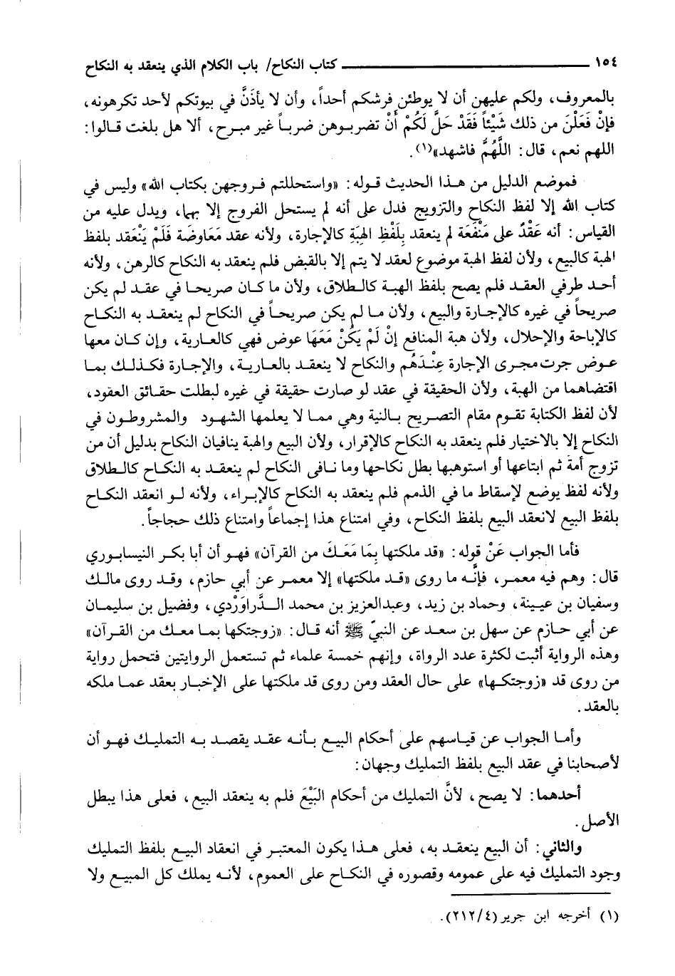فَمَوْضِعُ الدَّلِيلِ مِنْ هَذَا الْحَدِيثِ قَوْلُهُ: " وَاسْتَحْلَلْتُمْ فُرُوجَهُنَّ بِكِتَابِ اللَّهِ " وَلَيْسَ فِي كِتَابِ اللَّهِ إِلَّا لَفْظُ النِّكَاحِ وَالتَّزْوِيجِ فَدَلَّ عَلَى أَنَّهُ لَمْ يَسْتَحِلَّ الْفُرُوجَ إِلَّا بِهِمَا، وَيَدُلُّ عَلَيْهِ مِنَ الْقِيَاسِ: أَنَّهُ عقدٌ عَلَى مَنْفَعَةٍ لَمْ يَنْعَقِدْ بِلَفْظِ الْهِبَةِ كَالْإِجَارَةِ، وَلِأَنَّهُ عَقْدُ مُعَاوَضَةٍ فَلَمْ يَنْعَقِدْ بِلَفْظِ الْهِبَةِ كَالْبَيْعِ، وَلِأَنَّ لَفْظَ الْهِبَةِ مَوْضُوعٌ لِعَقْدٍ لَا يَتِمُّ إِلَّا بِالْقَبْضِ فَلَمْ يَنْعَقِدْ بِهِ النِّكَاحُ كَالرَّهْنِ، وَلِأَنَّهُ أَحَدُ طَرَفَيِ الْعَقْدِ فَلَمْ يَصِحَّ بِلَفْظِ الْهِبَةِ كَالطَّلَاقِ، وَلِأَنَّ مَا كَانَ صَرِيحًا فِي عَقْدٍ لَمْ يَكُنْ صَرِيحًا فِي غَيْرِهِ كَالْإِجَارَةِ وَالْبَيْعِ، وَلِأَنَّ مَا لَمْ يَكُنْ صَرِيحًا فِي النِّكَاحِ لَمْ يَنْعَقِدْ بِهِ النِّكَاحُ كَالْإِبَاحَةِ وَالْإِحْلَالِ، وَلِأَنَّ هِبَةَ الْمَنَافِعِ إِنْ لَمْ يَكُنْ مَعَهَا عِوَضٌ فَهِيَ كالعارية، وإن كان معها عوض جرت مَجْرَى الْإِجَارَةِ عِنْدَهُمْ وَالنِّكَاحُ لَا يَنْعَقِدُ بِالْعَارِيَةِ، وَالْإِجَارَةِ، فَكَذَلِكَ بِمَا اقْتَضَاهُمَا مِنَ الْهِبَةِ، وَلِأَنَّ الْحَقِيقَةَ فِي عَقْدٍ لَوْ صَارَتْ حَقِيقَةً فِي غيره لبطلت حقائق العقود، لأن لفظ الكتابة تقوم مقام التصريح بالنية وهي مما لا يعلمها الشهود والمشروطون في النكاح إلا بالاختيار فَلَمْ يَنْعَقِدْ بِهِ النِّكَاحُ كَالْإِقْرَارِ، وَلِأَنَّ الْبَيْعَ وَالْهِبَةَ يُنَافِيَانِ النِّكَاحَ بِدَلِيلِ أَنَّ مَنْ تَزَوَّجَ أَمَةً ثُمَّ ابْتَاعَهَا أَوِ اسْتَوْهَبَهَا بَطَلَ نِكَاحُهَا وَمَا نَافَى النِّكَاحَ لَمْ يَنْعَقِدْ بِهِ النِّكَاحُ كَالطَّلَاقِ وَلِأَنَّهُ لَفْظٌ يُوضَعُ لِإِسْقَاطِ مَا فِي الذِّمَمِ فَلَمْ يَنْعَقِدْ بِهِ النِّكَاحُ كَالْإِبْرَاءِ، وَلِأَنَّهُ لو انعقد النكاح بلفظ البيع لانعقد البيع بلفظ النكاح، وفي امتناع هذا إجماعاً وامتناع ذَلِكَ حِجَاجا.