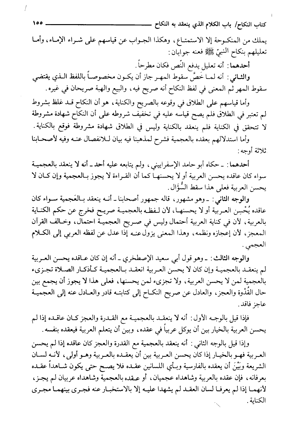 وَالْوَجْهُ الثَّانِي: - وَهُوَ مَشْهُورٌ، قَالَهُ جُمْهُورُ أَصْحَابِنَا - أَنَّهُ يَنْعَقِدُ بِالْعَجَمِيَّةِ سَوَاءً كَانَ عَاقِدُهُ يُحْسِنُ الْعَرَبِيَّةَ أَوْ لَا يُحْسِنُهَا، لِأَنَّ لَفْظَهُ بِالْعَجَمِيَّةِ صَرِيحٌ فَخَرَجَ عَنْ حُكْمِ الكناية بالعربية، لأن في كناية العربية احتمال وَلَيْسَ فِي صَرِيحِ الْعَجَمِيَّةِ احْتِمَالٌ، وَخَالَفَ الْقُرْآنَ المعجز، لأن إعجازه ونظمه، وَهَذَا الْمَعْنَى يَزُولُ عَنْهُ إِذَا عُدِلَ عَنْ لَفْظِهِ الْعَرَبِيِّ إِلَى الْكَلَامِ الْعَجَمِيِّ.