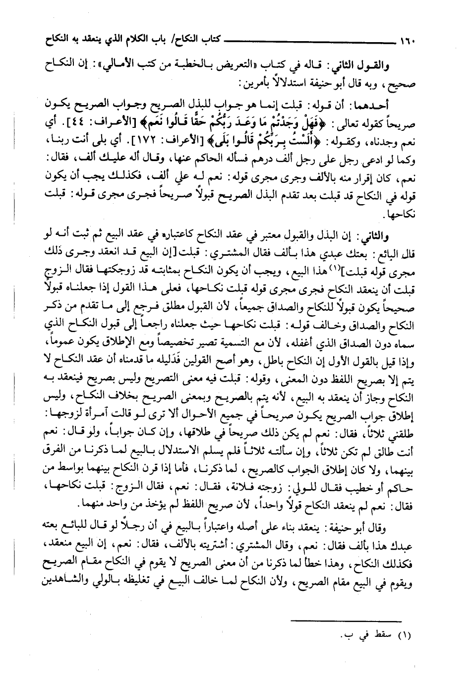 والثاني: إن البذل والقبول معتبر في عقد النكاح كاعتباره فِي عَقْدِ الْبَيْعِ ثُمَّ ثَبَتَ أَنَّهُ لَوْ قَالَ الْبَائِعُ: بِعْتُكَ عَبْدِي هَذَا بِأَلْفٍ فَقَالَ الْمُشْتَرِيَ: قَبِلْتُ إِنَّ الْبَيْعَ قَدِ انْعَقَدَ وَجَرَى ذلك مجرى قوله قبلت هذا البيع، ويجب أن يكون النكاح بمثابته قد زوجكتها فقال الزوج قبلت أن ينعقد النكاح فجرى مَجْرَى قَوْلِهِ قَبِلْتُ نِكَاحَهَا، فَعَلَى هَذَا الْقَوْلِ إذا جعلناه قبولاً صحيحاً يَكُونُ قَبُولًا لِلنِّكَاحِ وَالصَّدَاقِ جَمِيعًا، لِأَنَّ الْقَبُولَ مطلق فرجع إلى مَا تَقَدَّمَ مِنْ ذِكْرِ النِّكَاحِ وَالصَّدَاقِ وَخَالَفَ قَوْلَهُ: قَبِلْتُ نِكَاحَهَا حَيْثُ جَعَلْنَاهُ رَاجِعًا إِلَى قَبُولِ النِّكَاحِ الَّذِي سَمَّاهُ دُونَ الصَّدَاقِ الَّذِي أغفله، لأن مع التسمية تصير تَخْصِيصًا وَمَعَ الْإِطْلَاقِ يَكُونُ عُمُومًا، وَإِذَا قِيلَ بِالْقَوْلِ الْأَوَّلِ إِنَّ النِّكَاحَ بَاطِلٌ، وَهُوَ أَصَحُّ القولين فدليله ما قدمناه أَنَّ عَقْدَ النِّكَاحِ لَا يَتِمُّ إِلَّا بِصَرِيحِ اللَّفْظِ دُونَ الْمَعْنَى، وَقَوْلُهُ: قَبِلْتُ فِيهِ مَعْنَى التصريح وليس بصريح فينعقد بِهِ النِّكَاحُ وَجَازَ أَنْ يَنْعَقِدَ بِهِ الْبَيْعُ، لِأَنَّهُ يَتِمُّ بِالصَّرِيحِ وَبِمَعْنَى الصَّرِيحِ بِخِلَافِ النِّكَاحِ، وَلَيْسَ إِطْلَاقُ جَوَابِ الصَّرِيحِ يَكُونُ صَرِيحًا فِي جَمِيعِ الْأَحْوَالِ أَلَا تَرَى لَوْ قَالَتِ امْرَأَةٌ لِزَوْجِهَا: طَلِّقْنِي ثَلَاثًا، فَقَالَ: نَعَمْ لَمْ يَكُنْ ذَلِكَ صَرِيحًا فِي طَلَاقِهَا، وَإِنْ كَانَ جَوَابًا، ولو قال: نعم أنت طالق لم تكن ثَلَاثًا، وَإِنْ سَأَلَتْهُ ثَلَاثًا فَلَمْ يَسْلَمِ الِاسْتِدْلَالُ بالبيع لِمَا ذَكَرْنَا مِنَ الْفَرْقِ بَيْنَهُمَا، وَلَا كَانَ إِطْلَاقُ الْجَوَابِ كَالصَّرِيحِ، لِمَا ذَكَرْنَا، فَأَمَّا إِذَا قرن النكاح بينهما بواسط مِنْ حَاكِمٍ أَوْ خَطِيبٍ فَقَالَ لِلْوَلِيِّ: زَوَّجْتَهُ فلانة، فقال: نعم، فقال الزوج: قَبِلْتُ نِكَاحَهَا، فَقَالَ: نَعَمْ لَمْ يَنْعَقِدِ النِّكَاحُ قولاً واحداً، لأن صريح اللفظ لم يؤخذ مِنْ وَاحِدٍ مِنْهُمَا.