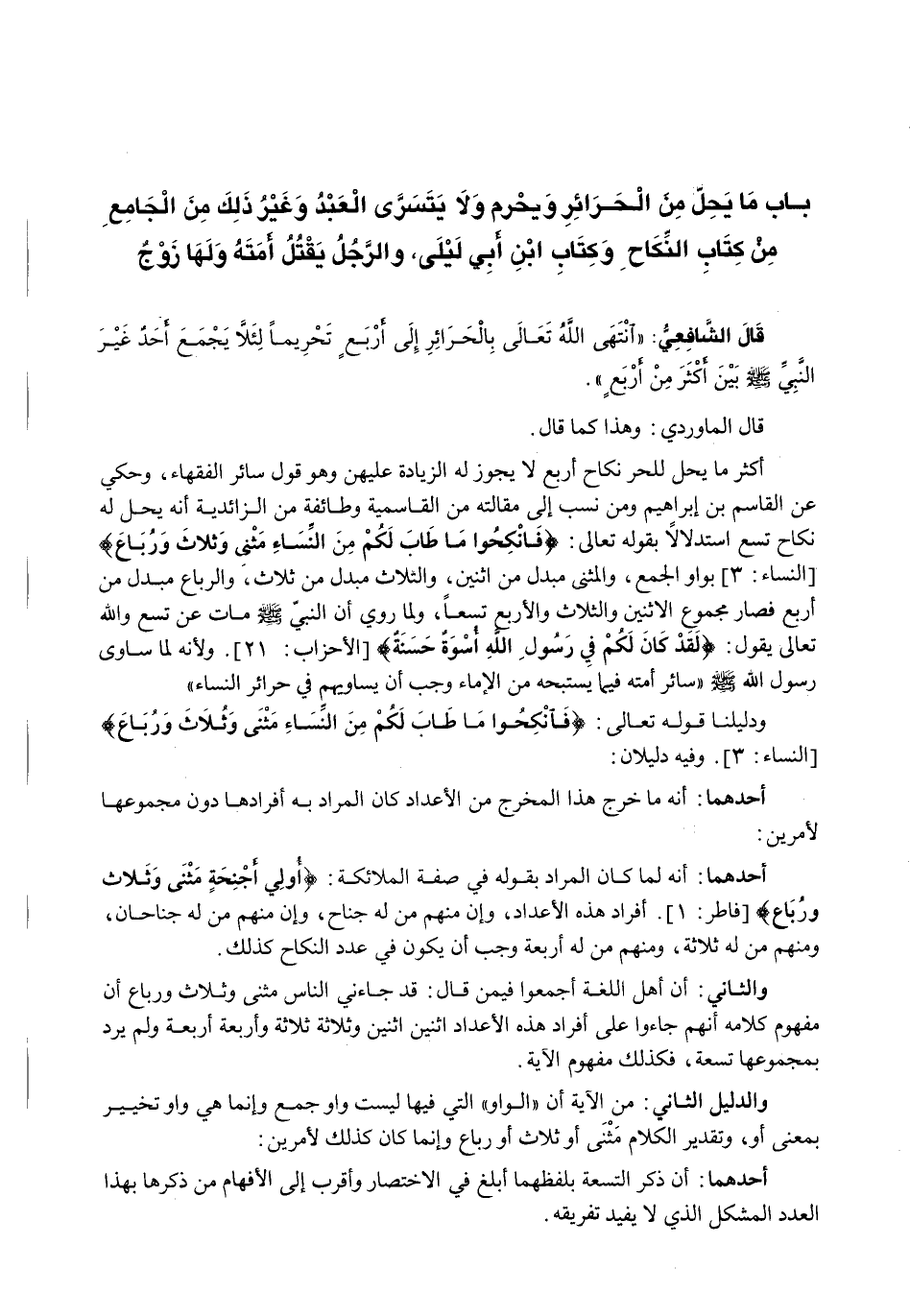 أَكْثَرُ مَا يَحِلُّ لِلْحُرِّ نِكَاحُ أَرْبَعٍ لَا يَجُوزُ لَهُ الزِّيَادَةُ عَلَيْهِنَّ وَهُوَ قَوْلُ سَائِرِ الْفُقَهَاءِ، وَحُكِيَ عَنِ الْقَاسِمِ بْنِ إبراهيم ومن نسب إلى مقالته ما القاسمية وطائفة من الزائدية أنه يحل له نِكَاحُ تِسْعٍ اسْتِدْلَالًا بِقَوْلِهِ تَعَالَى: {فَانْكِحُوا مَا طَابَ لَكُمْ مِنَ النِّسَاءِ مَثْنَى وَثَلاثَ وَرُبَاعَ} (النساء: 3) بِوَاوِ الْجَمْعِ، وَالْمَثْنَى مُبْدَلٌ مِنِ اثْنَيْنِ، وَالثُّلَاثُ مُبْدَلٌ مِنْ ثَلَاثٍ، وَالرُّبَاعُ مُبْدَلٌ مِنْ أَرْبَعٍ فَصَارَ مَجْمُوعُ الِاثْنَيْنِ وَالثَّلَاثِ وَالْأَرْبَعِ تِسْعًا، وَلِمَا رُوِيَ أَنَّ النَّبِيَّ - صَلَّى اللَّهُ عَلَيْهِ وَسَلَّم َ - مَاتَ عَنْ تِسْعٍ وَاللَّهُ تَعَالَى يَقُولُ: {لَقَدْ كَانَ لَكُمْ فِي رَسُولِ اللهِ أُسْوَةٌ حَسَنَةٌ) {الأحزاب: 21) . ولأنه لما سَاوَى رَسُولُ اللَّهِ - صَلَّى اللَّهُ عَلَيْهِ وَسَلَّم َ - " سائر أمته فيما يستبحه مِنَ الْإِمَاءِ وَجَبَ أَنْ يُسَاوِيَهُمْ فِي حَرَائِرِ النِّسَاءِ ".