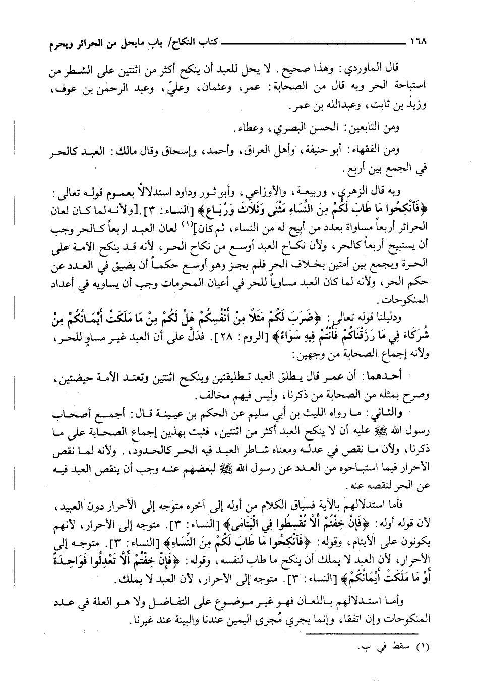 وَمِنَ الْفُقَهَاءِ: أبو حنيفة، وَأَهْلُ الْعِرَاقِ، وَأَحْمَدُ، وَإِسْحَاقُ وَقَالَ مَالِكٌ: الْعَبْدُ كَالْحُرِّ فِي الْجَمْعِ بَيْنَ أَرْبَعٍ.