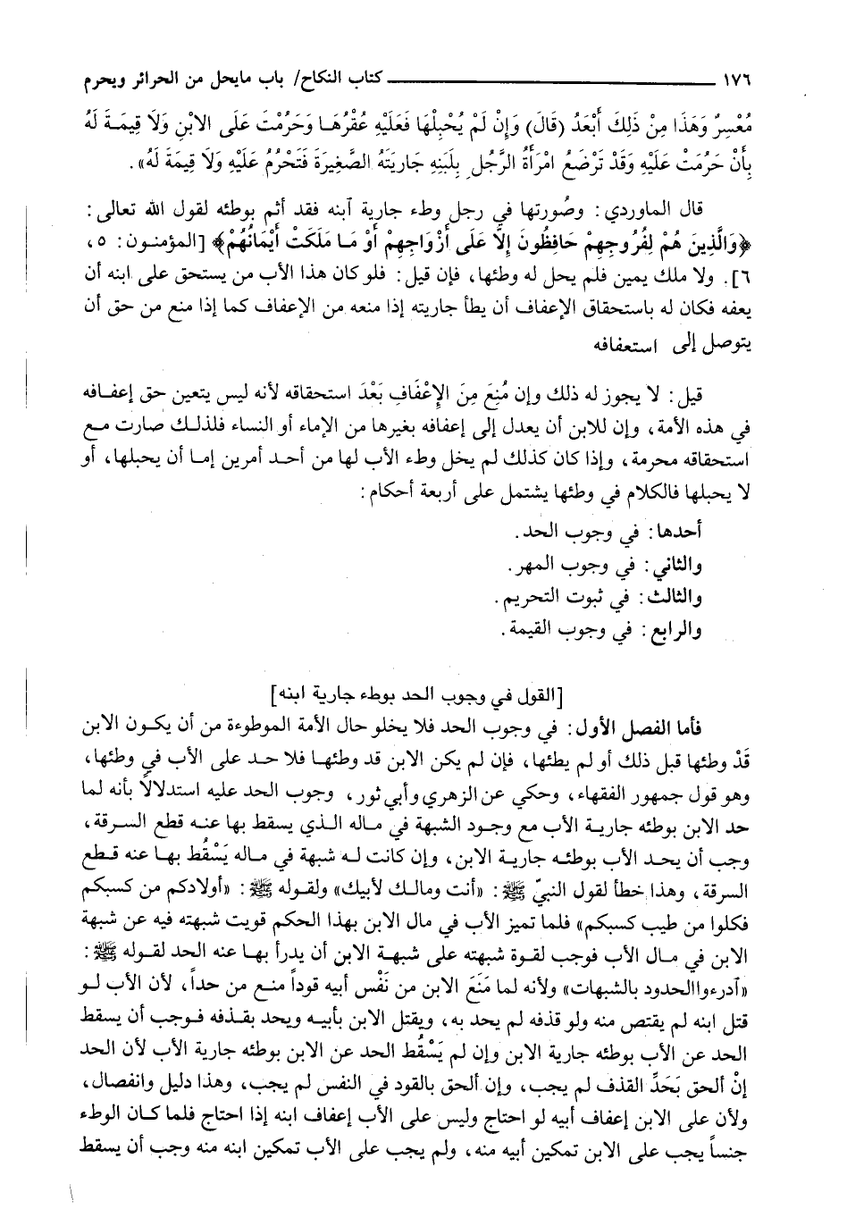 قال الماوردي: وصورتها في رجلٍ وطء جارية ابنه فقد أثم بوطئه لقول الله تعالى: {وَالَّذِينَ هُمْ لِفُرُوجِهِمْ حَافِظُونَ إِلاَّ عَلَى أزْوَاجِهِمْ أَوْ مَا مَلَكَتْ أيْمَانُهُمْ) {المؤمنون: 5، 6) . وَلَا مِلْكَ يَمِينٍ فَلَمْ يَحِلَّ لَهُ وَطِئُهَا، فإن قيل: فلو كان هذا الأب من يستحق على ابنه أن يعفه فكان لَهُ بِاسْتِحْقَاقِ الْإِعْفَافِ أَنْ يَطَأَ جَارِيَتَهُ إِذَا مَنَعَهُ مِنَ الْإِعْفَافِ كَمَا إِذَا مُنِعَ مِنْ حق أن يتوصل إلى استعفافه.