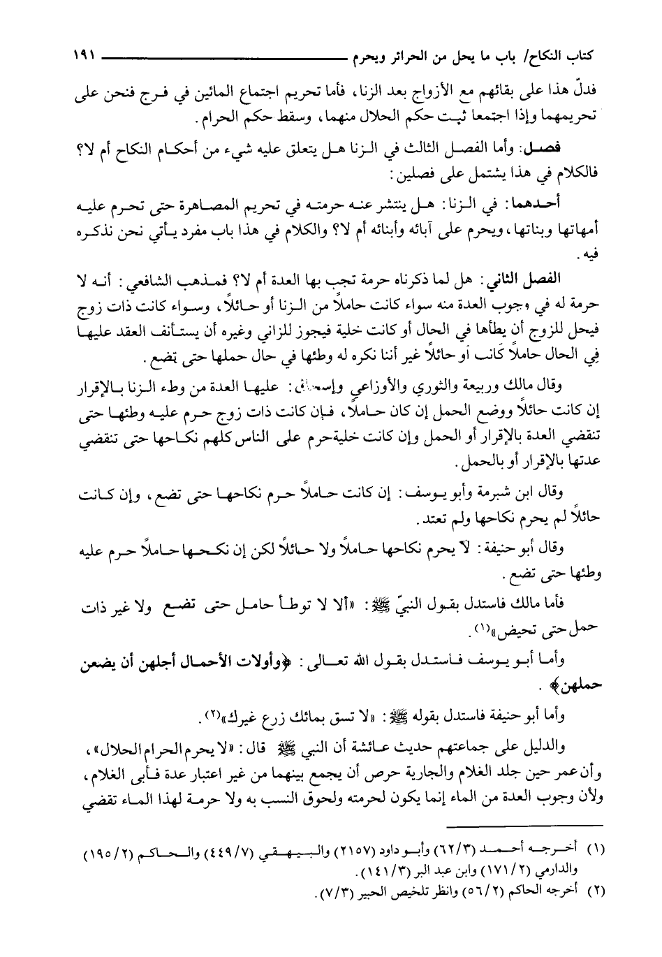 وَأَمَّا الْفَصْلُ الثَّالِثُ في الزنا هل يتعلق عليه شيء من أَحْكَامِ النِّكَاحِ أَمْ لَا؟ فَالْكَلَامُ فِي هَذَا يَشْتَمِلُ عَلَى فَصْلَيْنِ: