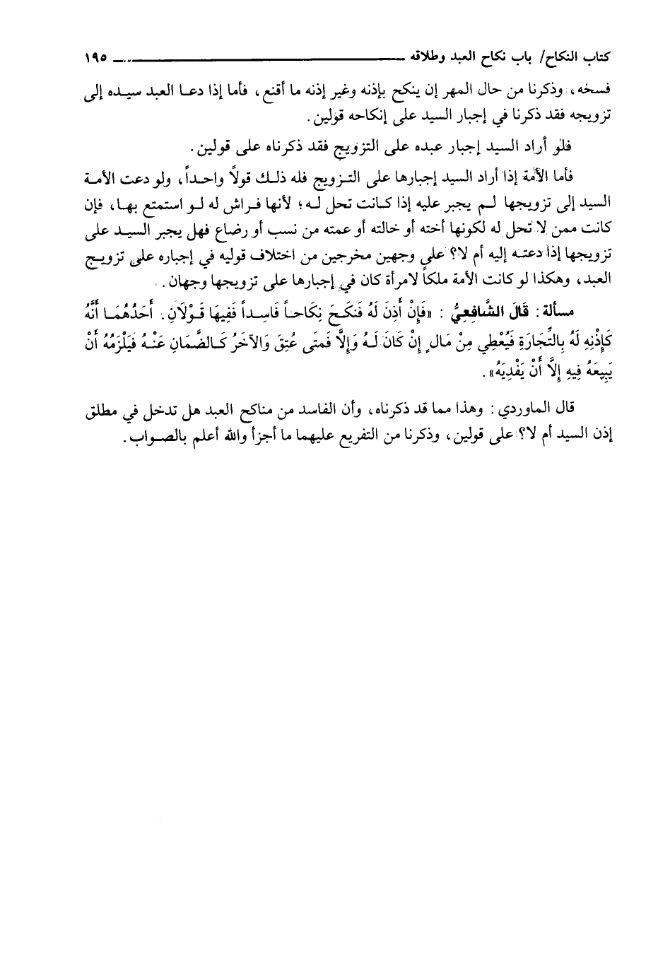 قال الماوردي: وهذا مما قد ذكرناه، وأن الفاسد من مناكح العبد هل تدخل فِي مُطْلَقِ إِذْنِ السَّيِّدِ أَمْ لَا؟ عَلَى قولين، وذكرنا من التفريع عليهما مَا أَجْزَأَ وَاللَّهُ أَعْلَمُ بِالصَّوَابِ.