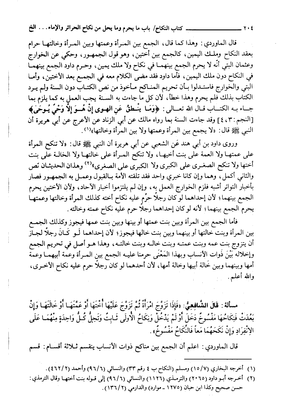 قَالَ الْمَاوَرْدِيُّ: وَهَذَا كَمَا قَالَ، الْجَمْعُ بَيْنَ الْمَرْأَةِ وَعَمَّتِهَا وَبَيْنَ الْمَرْأَةِ وَخَالَتِهَا حَرَامٌ بِعَقْدِ النِّكَاحِ وَمِلْكِ الْيَمِينِ، كَالْجَمْعِ بَيْنَ أُخْتَيْنِ، وَهُوَ قول الجمهور، وحكي عن الخوارج وعثمان الْبَتِّيِّ أَنَّهُ لَا يَحْرُمُ الْجَمْعُ بَيْنَهُمَا فِي نِكَاحٍ وَلَا مِلْكِ يَمِينٍ، وَحَرَّمَ دَاوُدُ الْجَمْعَ بَيْنَهُمَا فِي النِّكَاحِ دُونَ مِلْكِ الْيَمِينِ، فَأَمَّا دَاوُدُ فَقَدْ مَضَى الْكَلَامُ مَعَهُ فِي الْجَمْعِ بين الْأُخْتَيْنِ، وَأَمَّا الْبَتِّيُّ وَالْخَوَارِجُ فَاسْتَدَلُّوا بِأَنَّ تَحْرِيمَ المناكح مأخوذ مِنْ نَصِّ الْكِتَابِ دُونَ السُّنَّةِ وَلَمْ يَرِدِ الْكِتَابُ بِذَلِكَ فَلَمْ يَحْرُمْ وَهَذَا خَطَأٌ، لِأَنَّ كُلَّ مَا جَاءَتْ بِهِ السُّنَّةُ يَجِبُ الْعَمَلُ بِهِ كَمَا يُلْزَمُ بِمَا جَاءَ بِهِ الْكِتَابُ قَالَ اللَّهُ تَعَالَى: {وَمَا يَنْطِقُ عَنِ الهَوَى إنْ هُوَ إلاَّ وَحِيٌ يُوْحَى} (النجم: 3 و 4) وَقَدْ جَاءَتِ السُّنَّةُ بِمَا رَوَاهُ مَالِكٌ عَنْ أَبِي الزِّنَادِ عَنِ الْأَعْرَجِ عَنْ أَبِي هُرَيْرَةَ أَنَّ النَّبِيَّ - صَلَّى اللَّهُ عَلَيْهِ وَسَلَّم َ - قَالَ: " لَا يُجْمَعُ بَيْنَ الْمَرْأَةِ وَعَمَّتِهَا وَلَا بَيْنَ الْمَرْأَةِ وَخَالَتِهَا "