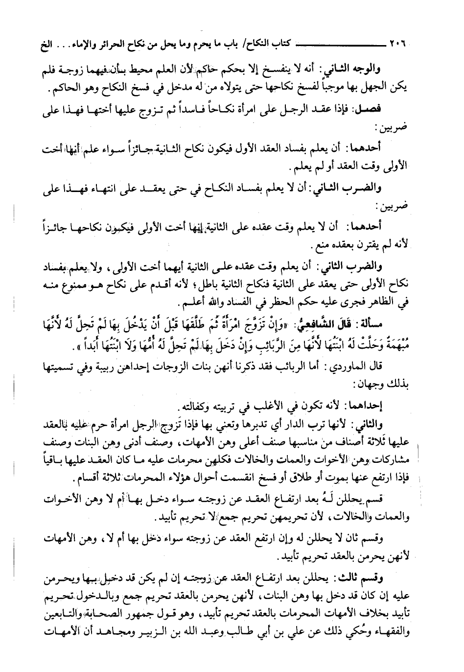 وَالثَّانِي: لِأَنَّهَا تَرُبُّ الدَّارَ أَيْ تُدَبِّرُهَا وَتُعْنَى بِهَا فَإِذَا تَزَوَّجَ الرَّجُلُ امْرَأَةً حَرُمَ عَلَيْهِ بِالْعَقْدِ عليها ثلاثة أصناف من مناسبها صِنْفٌ أَعْلَى وَهُنَّ الْأُمَّهَاتُ، وَصِنْفٌ أَدْنَى وَهُنَّ الْبَنَاتُ وَصِنْفٌ مُشَارِكَاتٌ وَهُنَّ الْأَخَوَاتُ وَالْعَمَّاتُ وَالْخَالَاتُ فَكُلُّهُنَّ مُحَرَّمَاتٌ عَلَيْهِ مَا كَانَ الْعَقْدُ عَلَيْهَا باقياً فإذا ارتفع عَنْهَا بِمَوْتٍ أَوْ طَلَاقٍ أَوْ فَسْخٍ انْقَسَمَتْ أَحْوَالُ هَؤُلَاءِ الْمُحَرَّمَاتِ ثَلَاثَةَ أَقْسَامٍ.