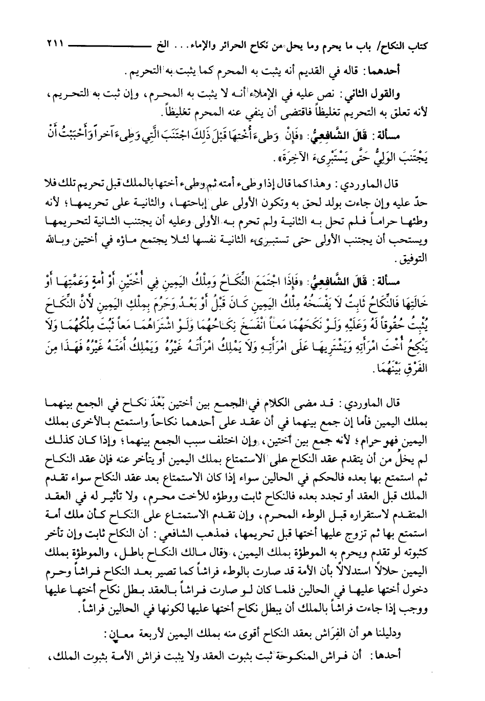 قال الشافعي: " فإذا اجْتَمَعَ النِّكَاحُ وَمِلْكُ الْيَمِينِ فِي أُخْتَيْنِ أَوْ أمةٍ وَعَمَّتِهَا أَوْ خَالَتِهَا فَالنِّكَاحُ ثابتٌ لَا يَفْسَخُهُ مِلْكُ الْيَمِينِ كَانَ قَبْلُ أَوْ بَعْدُ وحرم بملك الْيَمِينِ لِأَنَّ النِّكَاحَ يُثْبِتُ حُقُوقًا لَهُ وَعَلَيْهِ وَلَوْ نَكَحَهُمَا مَعًا انْفَسَخَ نِكَاحُهُمَا وَلَوِ اشْتَرَاهُمَا مَعًا ثَبَتَ مِلْكُهُمَا وَلَا يَنْكِحُ أُخْتَ امْرَأَتِهِ وَيَشْتَرِيهَا عَلَى امْرَأَتِهِ وَلَا يُمَلِّكُ امْرَأَتَهُ غَيْرَهُ وَيُمَلِّكُ أَمَتَهُ غَيْرَهُ فَهَذَا مِنَ الْفَرْقِ بَيْنَهُمَا ".