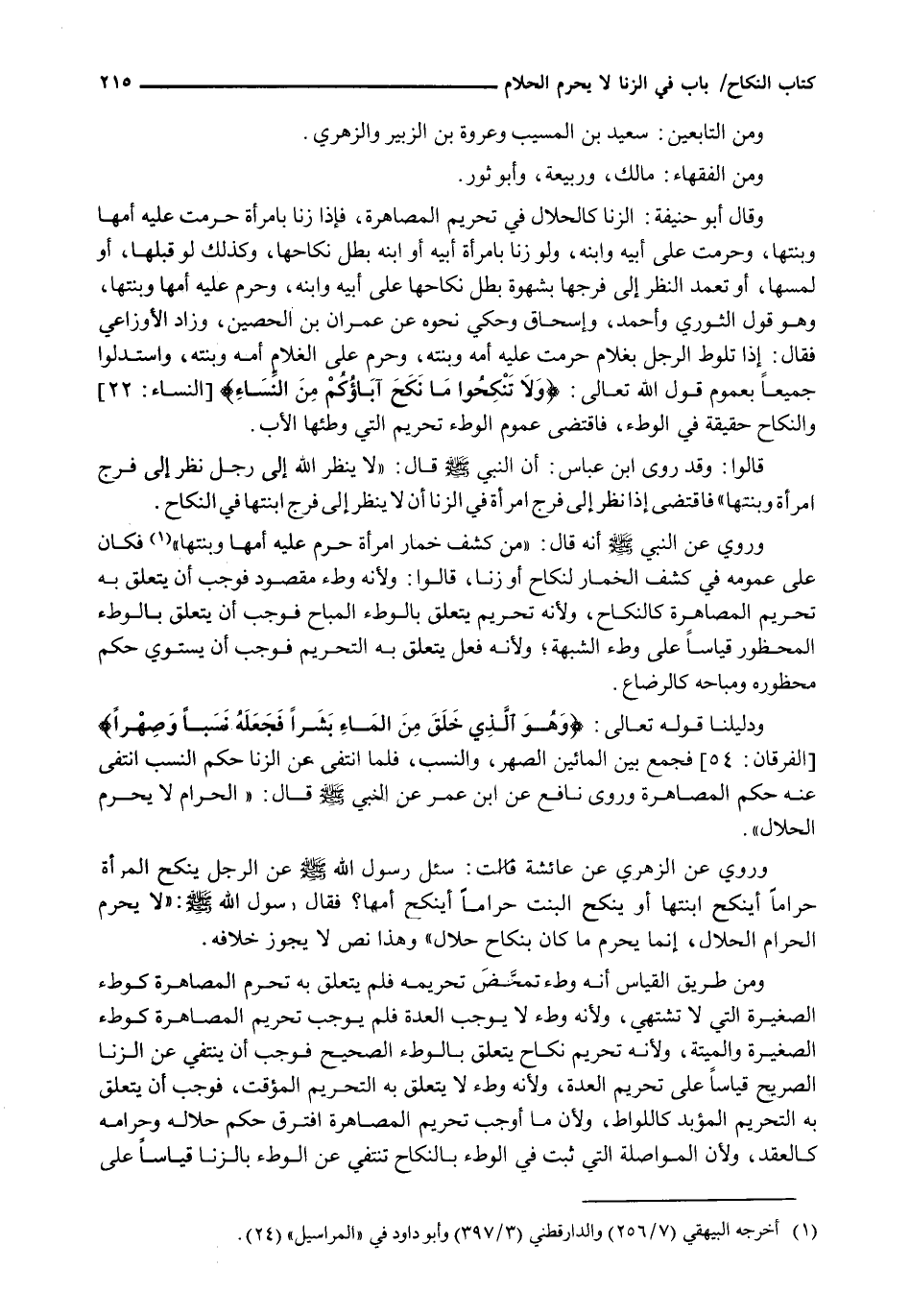 وَقَالَ أبو حنيفة: الزِّنَا كَالْحَلَالِ فِي تحريم المصاهرة، فإذا زنا بِامْرَأَةٍ حَرُمَتْ عَلَيْهِ أُمُّهَا وَبِنْتُهَا، وَحَرُمَتْ عَلَى أبيه وابنه، ولو زنا بِامْرَأَةِ أَبِيهِ أَوِ ابْنِهِ بَطَلَ نِكَاحُهَا، وَكَذَلِكَ لَوْ قَبَّلَهَا، أَوْ لَمَسَهَا، أَوْ تَعَمَّدَ النَّظَرَ إلى فرجها بشهوة بطل نكاحها على أبيه وابنه، وحرم عليها أُمُّهَا وَبِنْتُهَا، وَهُوَ قَوْلُ الثَّوْرِيِّ وَأَحْمَدَ، وَإِسْحَاقَ وحكي نحوه عَنْ عِمْرَانَ بْنِ الْحُصَيْنِ، وَزَادَ الْأَوْزَاعِيُّ فَقَالَ: إِذَا تَلَوَّطَ الرَّجُلُ بِغُلَامٍ حَرُمَتْ عَلَيْهِ أُمُّهُ وَبِنْتُهُ، وَحَرُمَ عَلَى الْغُلَامِ أُمُّهُ وَبِنْتُهُ، وَاسْتَدَلُّوا جَمِيعًا بِعُمُومِ قَوْلِ اللَّهِ تَعَالَى: {وَلاَ تَنْكِحُوا مَا نَكَحَ آبَاؤُكُمْ مِنَ النِّسَاءِ) {النساء: 22) وَالنِّكَاحُ حَقِيقَةٌ فِي الْوَطْءِ، فَاقْتَضَى عُمُومُ الْوَطْءِ تَحْرِيمَ الَّتِي وَطِئَهَا الْأَبُ.