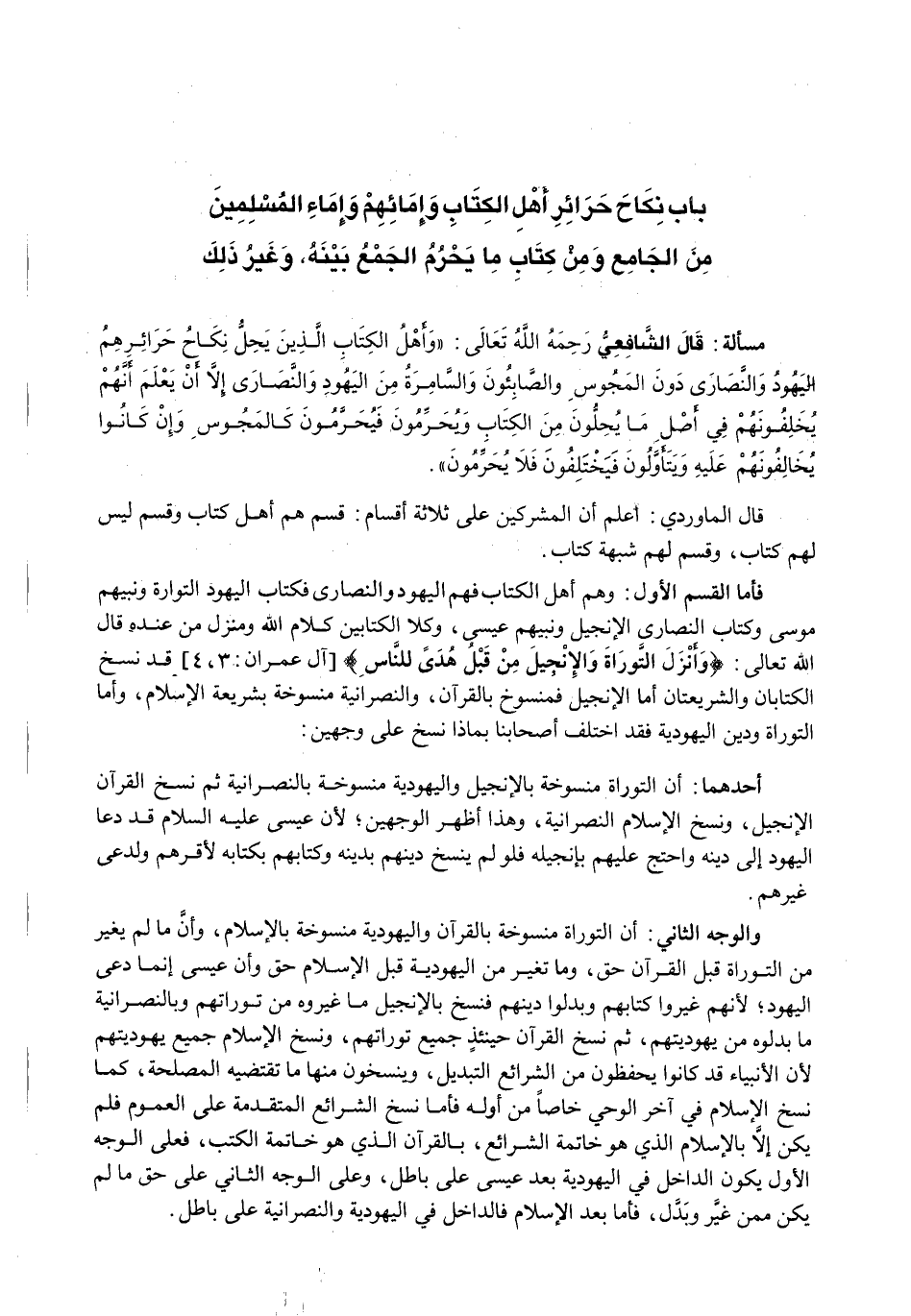 قال الشافعي رحمه الله تعالى: " وَأَهْلُ الْكِتَابِ الَّذِينَ يَحِلُّ نِكَاحُ حَرَائِرِهِمُ الْيَهُودُ والنصارى دون المجوس والصابئون وَالسَّامِرَة مِنَ الْيَهُودِ وَالنَّصَارَى إِلَّا أَنْ يُعْلَمَ أنهم يخلفونهم فِي أَصْلِ مَا يُحِلُّونَ مِنَ الْكِتَابِ وَيُحَرِّمُونَ فيحرمون كالمجوس وإن كانوا يخالفونهم عَلَيْهِ وَيَتَأَوَّلُونَ فَيَخْتَلِفُونَ فَلَا يُحَرَّمُونَ ".