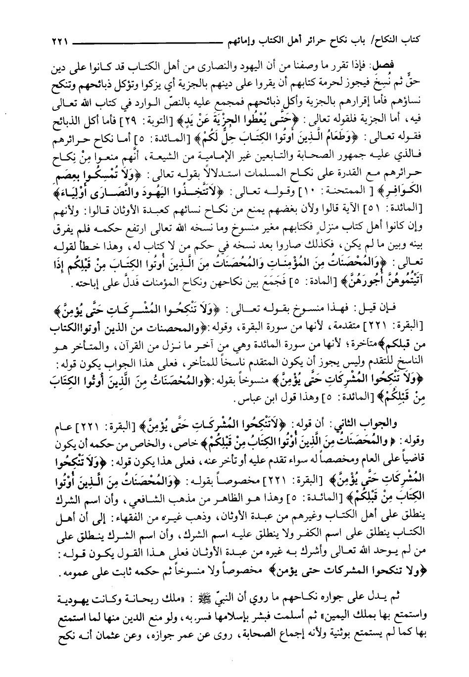 فَإِذَا تَقَرَّرَ مَا وَصَفْنَا مِنْ أَنَّ الْيَهُودَ وَالنَّصَارَى مِنْ أَهْلِ الْكِتَابِ قَدْ كَانُوا عَلَى دِينٍ حَقٍّ ثُمَّ نُسِخَ فَيَجُوزُ لِحُرْمَةِ كتابهم أن يقروا على دينهم بالجزية أي يزكوا وَتُؤْكَلُ ذَبَائِحُهُمْ وَتُنْكَحُ نِسَاؤُهُمْ فَأَمَّا إِقْرَارُهُمْ بِالْجِزْيَةِ وأكل ذبائحهم فمجمع عليه بالنص الْوَارِدِ فِي كِتَابِ اللَّهِ تَعَالَى فِيهِ، أَمَّا الْجِزْيَةُ فَلِقَوْلِهِ تَعَالَى: {حَتَّى يُعْطُوا الجِزْيَةَ عَنْ يَدٍ) {التوبة: 29) فأما أكل الذبائح فقوله تَعَالَى: {وَطَعَامُ الَّذِينَ أُوتُوا الكِتَابَ حِلٌّ لَكُمْ) {المائدة: 5) أما نِكَاحُ حَرَائِرِهِمْ فَالَّذِي عَلَيْهِ جُمْهُورُ الصَّحَابَةِ وَالتَّابِعِينَ غير الْإِمَامِيَّةِ مِنَ الشِّيعَةِ، أَنَّهُمْ مَنَعُوا مِنْ نِكَاحِ حَرَائِرِهِمْ مَعَ الْقُدْرَةِ عَلَى نِكَاحِ الْمُسْلِمَاتِ اسْتِدْلَالًا بِقَوْلِهِ تَعَالَى: {وَلاَ تُمْسِكُوا بِعِصَمِ الكَوَافِرِ) {الممتحنة: 10) وقوله تَعَالَى: {لاَ تَتَّخِذُوا اليَهُودَ والنَّصَارَى أَوْلِيَاءَ} (المائدة: 51) الآية قالوا: ولأن بغضهم يمنع من نكاح نسائهم كعبدة الْأَوْثَانِ قَالُوا: وَلِأَنَّهُمْ وَإِنْ كَانُوا أَهْلَ كِتَابٍ منزلٍ فكتابهم مغير مَنْسُوخٌ وَمَا نَسَخَهُ اللَّهُ تَعَالَى ارْتَفَعَ حُكْمُهُ فَلَمْ يُفَرَّقْ بَيْنَهُ وَبَيْنَ مَا لَمْ يَكُنْ، فَكَذَلِكَ صَارُوا بَعْدَ نَسْخِهِ فِي حُكْمِ مَنْ لَا كِتَابَ لَهُ، وَهَذَا خَطَأٌ لِقَوْلِهِ تَعَالَى: {وَالمُحْصَنَاتُ مِنَ المُؤْمِنَاتِ وَالمُحْصِنَاتُ مِنَ الَّذِينَ أُوتُوا الكِتَابَ مِنْ قَبْلِكُمْ إذَا آتَيْتُمُوهُنَّ أُجُورَهُنَّ) {المائدة: 5) فَجَمَعَ بَيْنَ نِكَاحِهِنَّ وَنِكَاحِ الْمُؤْمِنَاتِ فَدَلَّ عَلَى إِبَاحَتِهِ.