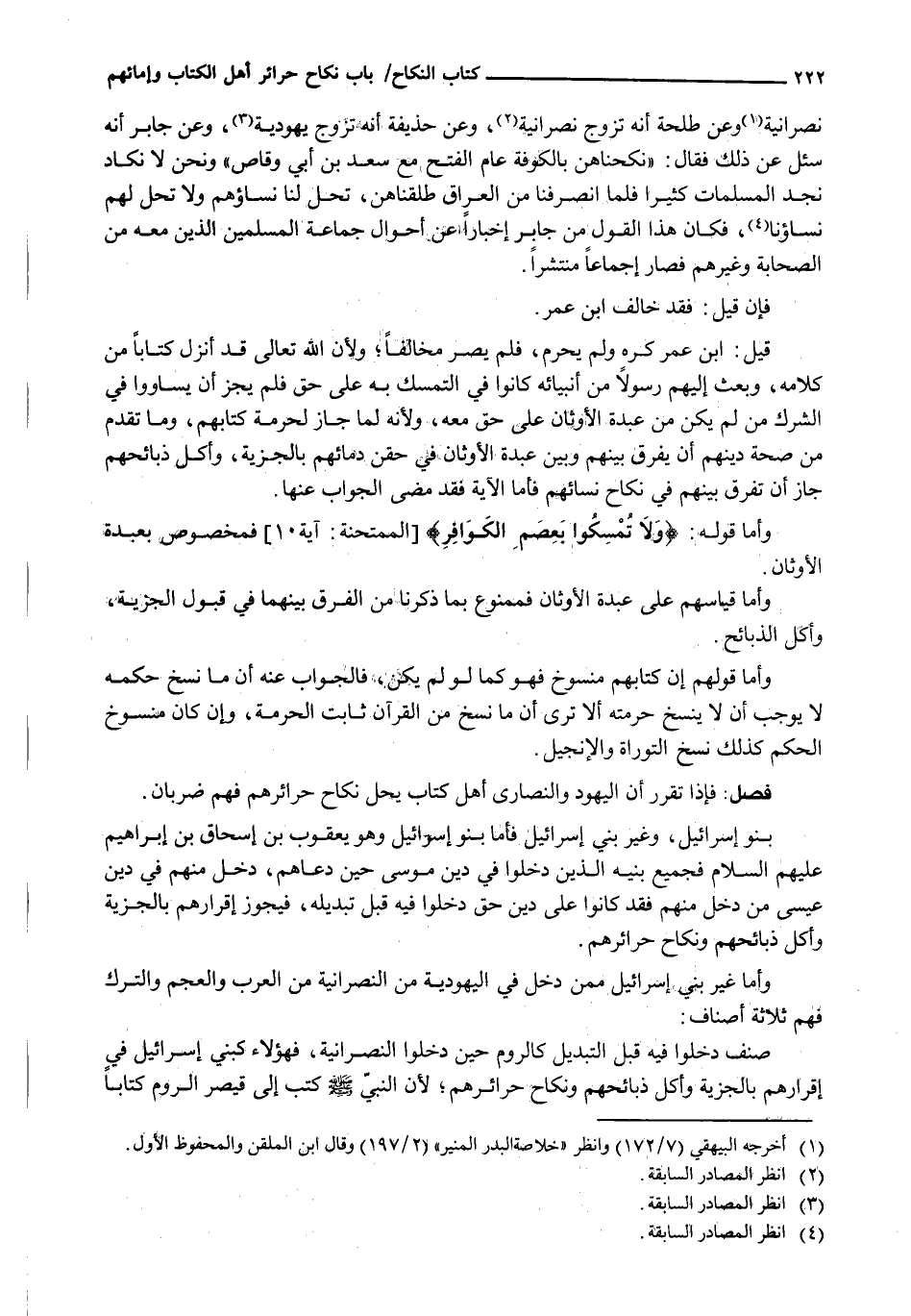 نَصْرَانِيَّةً وَعَنْ طَلْحَةَ أَنَّهُ تَزَوَّجَ نَصْرَانِيَّةً، وَعَنْ حُذَيْفَةَ أَنَّهُ تَزَوَّجَ يَهُودِيَّةً، وَعَنْ جَابِرٍ أَنَّهُ سُئِلَ عَنْ ذَلِكَ فَقَالَ: " نَكَحْنَاهُنَّ بِالْكُوفَةِ عَامَ الْفَتْحِ مَعَ سَعْدِ بْنِ أَبِي وَقَّاصٍ " وَنَحْنُ لَا نَكَادُ نَجِدُ الْمُسْلِمَاتِ كَثِيرًا فَلَمَّا انْصَرَفْنَا من العراق طلقناهن، تحل لنا نساؤهم ولا تحل لَهُمْ نِسَاؤُنَا، فَكَانَ هَذَا الْقَوْلُ مِنْ جَابِرٍ إخباراً عن أحوال جماعة المسلمين الذين مَعَهُ مِنَ الصَّحَابَةِ وَغَيْرِهِمْ فَصَارَ إِجْمَاعًا مُنْتَشِرًا.