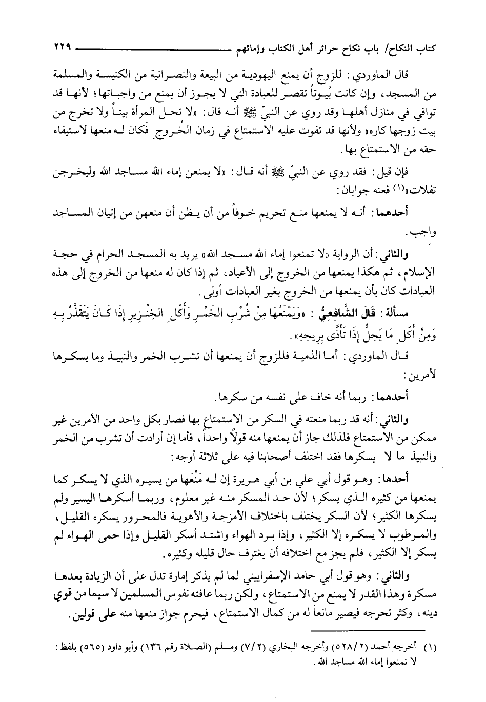وَالثَّانِي: أَنَّهُ قد رُبَّمَا مَنَعَتْهُ فِي السُّكْرِ مِنَ الِاسْتِمْتَاعِ بِهَا فَصَارَ بِكُلِّ وَاحِدٍ مِنَ الْأَمْرَيْنِ غَيْرَ مُمَكَّنٍ مِنَ الِاسْتِمْتَاعِ فَلِذَلِكَ جَازَ أَنْ يَمْنَعَهَا مِنْهُ قولاً واحداً، فأما إذا أَرَادَتْ أَنْ تَشْرَبَ مِنَ الْخَمْرِ وَالنَّبِيذِ مَا لا يسكرها فَقَدِ اخْتَلَفَ أَصْحَابُنَا فِيهِ عَلَى ثَلَاثَةِ أَوْجُهٍ: