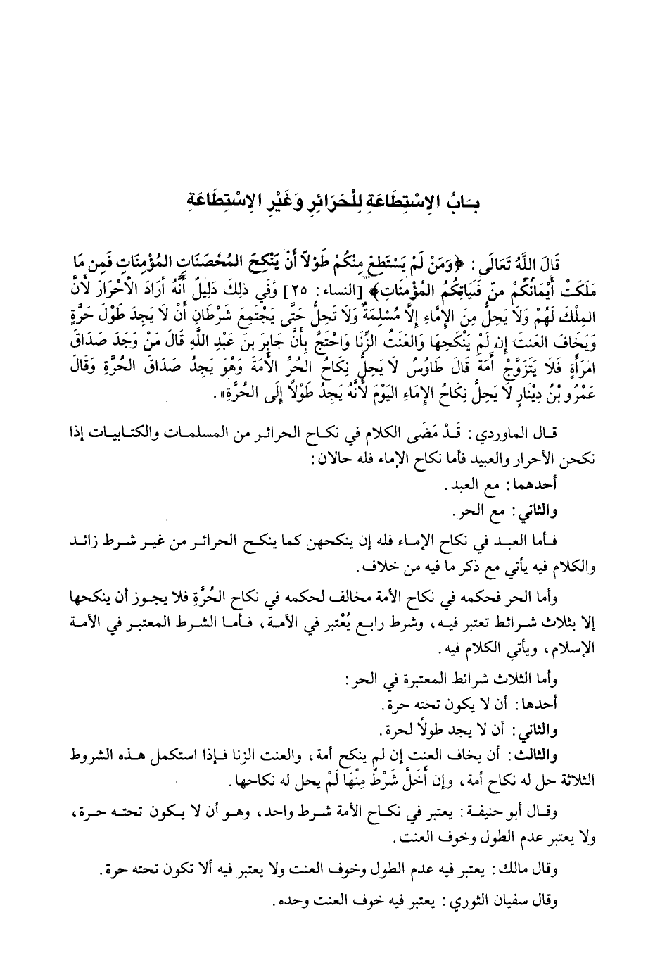 قَالَ اللَّهُ تَعَالَى: {وَمَنْ لَمْ يَسْتَطِعْ مِنْكُمْ طَوْلاً أنْ يَنْكِحَ المُحْصَنَاتِ المُؤْمِنَاتِ فَمِن مَا مَلَكَتْ أيْمَانُكُمْ مِنْ فَتَيَاتِكُمْ المْؤْمِنَاتِ) {النساء: 25) وَفَيِ ذَلِكَ دليلٌ أَنَّهُ أَرَادَ الْأَحْرَارَ لِأَنَّ الملك لهم ولا يحل مِنَ الْإِمَاءِ إِلَّا مسلمةٌ وَلَا تَحِلُّ حَتَّى تجتمع شرطان أن لا يجد طول حرةٍ وَيَخَافَ الْعَنَتَ إِنْ لَمْ يَنْكحهَا وَالْعَنَتُ الزِّنَا واحتج بأن جابر بن عبد الله قال من وجد صداق امرأةٍ فلا يتزوج أمة قال طاوس لا يحل نكاح الحر الأمة وهو يجد صداق الحرة وقال عمرو بن دينارٍ لا يحل نكاح الإماء اليوم لأنه يجد طولاً إلى الحرة ".