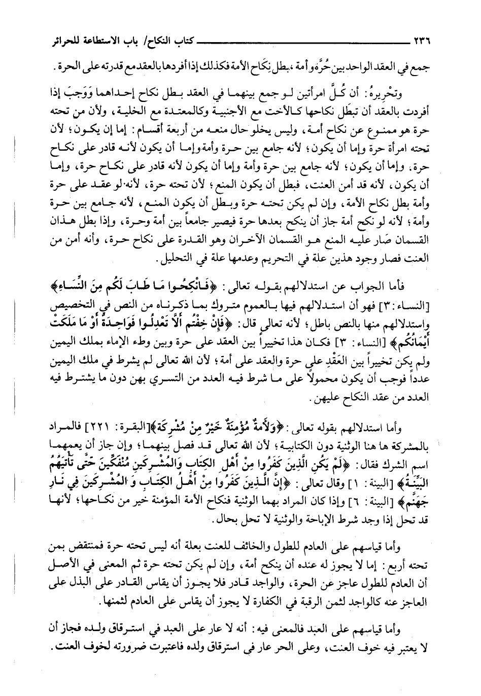 وَأَمَّا اسْتِدْلَالُهُمْ بِقَوْلِهِ تَعَالَى: {وَلأمَةٌ مُؤْمِنَةٌ خَيْرٌ مِنْ مُشْرِكَة) {البقرة: 221) فَالْمُرَادُ بِالْمُشْرِكَةِ هَاهُنَا الْوَثَنِيَّةُ دُونَ الْكِتَابِيَّةِ؛ لِأَنَّ اللَّهَ تَعَالَى قَدْ فَصَلَ بينهما؛ وإن جاز أن يعمهما اسم الشرك فَقَالَ: {لَمْ يَكُنِ الَّذِينَ كَفَرُوا مِنْ أهْلِ الكِتَابِ وَالمُشْرِكِينَ مُنْفَكِّينَ حَتَّى تَأْتِيَهُمْ البَيِّنَةِ) {البينة: 1) وَقَالَ تَعَالَى: {إِنَّ الَّذِينَ كَفَرُوا مِنْ أَهْلِ الكِتَابِ وَالمُشْرِكِينَ فِي نَارِ جَهَنَّم) {البينة: 6) وَإِذَا كَانَ الْمُرَادُ بِهَا الْوَثَنِيَّةُ فَنِكَاحُ الْأَمَةِ الْمُؤْمِنَةِ خَيْرٌ مِنْ نِكَاحِهَا؛ لِأَنَّهَا قَدْ تَحِلُّ إِذَا وُجِدَ شَرْطُ الْإِبَاحَةِ وَالْوَثَنِيَّةُ لَا تَحِلُّ بِحَالٍ.