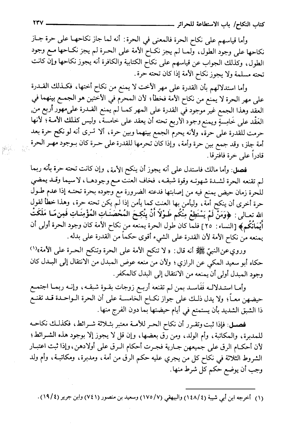 وَأَمَّا قِيَاسُهُمْ عَلَى نِكَاحِ الْحُرَّةِ فَالْمَعْنَى فِي الْحُرَّةِ. أَنَّهُ لَمَّا جَازَ نِكَاحُهَا عَلَى حُرَّةٍ جاز نكاحها على وُجُودِ الطَّوْلِ، وَلَمَّا لَمْ يَجُزْ نِكَاحُ الْأَمَةِ على الحرة لَمْ يَجُزْ نِكَاحُهَا مَعَ وُجُودِ الطَّوْلِ، وَكَذَلِكَ الْجَوَابُ عَنْ قِيَاسِهِمْ عَلَى نِكَاحِ الْكِتَابِيَّةِ وَالْكَافِرَةِ أَنَّهُ يَجُوزُ نِكَاحُهَا وَإِنْ كَانَتْ تَحْتَهُ مُسْلِمَةٌ وَلَا يَجُوزُ نِكَاحُ الْأَمَةِ إِذَا كَانَ تَحْتَهُ حُرَّةٌ.