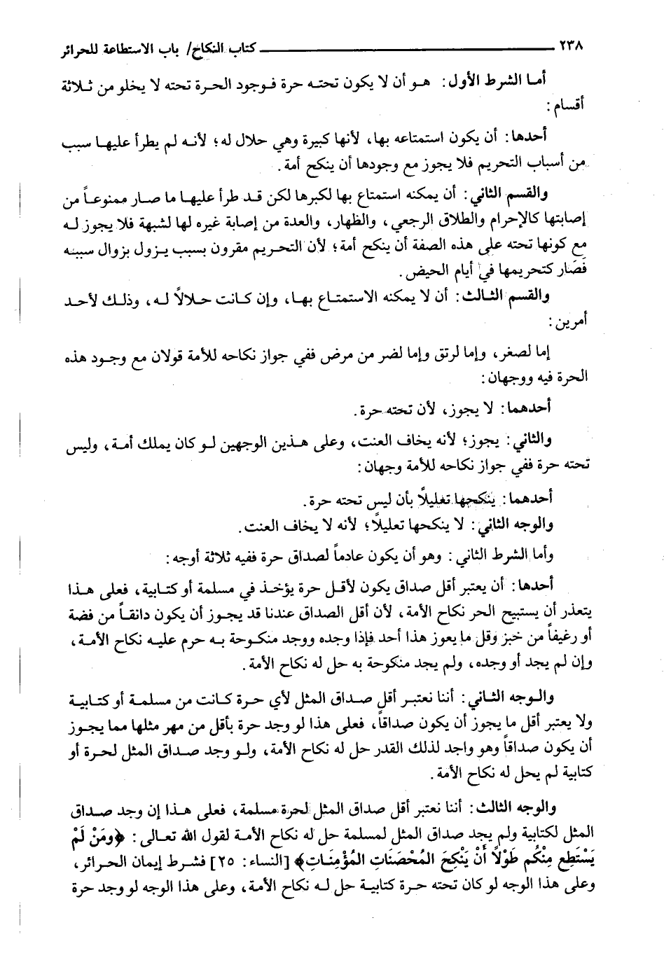 أما الشرط الأول: هو أَنْ لَا يَكُونَ تَحْتَهُ حُرَّةٌ فَوُجُودُ الْحُرَّةِ تَحْتَهُ لَا يَخْلُو مِنْ ثَلَاثَةِ أَقْسَامٍ: