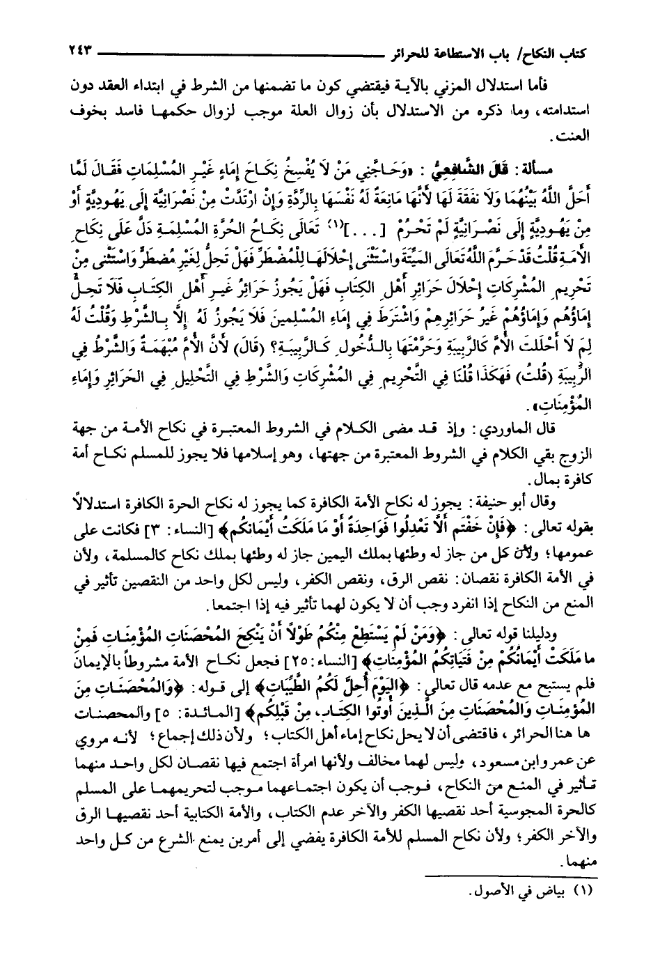 قَالَ الْمَاوَرْدِيُّ: وَإِذْ قَدْ مَضَى الْكَلَامُ فِي الشُّرُوطِ الْمُعْتَبَرَةِ فِي نِكَاحِ الْأَمَةِ مِنْ جِهَةِ الزَّوْجِ بَقِيَ الْكَلَامُ فِي الشُّرُوطِ الْمُعْتَبَرَةِ مِنْ جِهَتِهَا، وَهُوَ إِسْلَامُهَا فلا يجوز للمسلم نكاح أمة كافرة بمال.