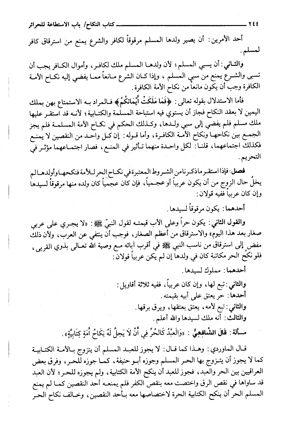 قَالَ الْمَاوَرْدِيُّ: وَهَذَا كَمَا قَالَ: لَا يَجُوزُ لِلْعَبْدِ الْمُسْلِمِ أَنْ يَتَزَوَّجَ بِالْأَمَةِ الْكِتَابِيَّةِ كَمَا لَا يَجُوزُ أَنْ يَتَزَوَّجَ بِهَا الْحُرُّ الْمُسْلِمُ وَجَوَّزَهُ أبو حنيفة، كَمَا جَوَّزَهُ لِلْحُرِّ، وَفَرَّقَ بَعْضُ الْعِرَاقِيِّينَ بَيْنَ الْحُرِّ والعبد، فجوز للعبد أن ينكح الأمة الكتابيةن وَلَمْ يُجَوِّزْهُ لِلْحُرِّ، لِأَنَّ الْعَبْدَ قَدْ سَاوَاهَا فِي نَقْصِ الرِّقِّ وَاخْتُصَّتْ مَعَهُ بِنَقْصِ الْكُفْرِ فَلَمْ يَمْنَعْهُ أَحَدُ النَّقْصَيْنِ كَمَا لَمْ يَمْنَعِ الْمُسْلِمَ الْحُرَّ أَنْ يَنْكِحَ الْكِتَابِيَّةَ الْحُرَّةَ لِاخْتِصَاصِهَا مَعَهُ بِأَحَدِ النَّقْصَيْنِ، وَخَالَفَ نِكَاحَ الْحُرِّ