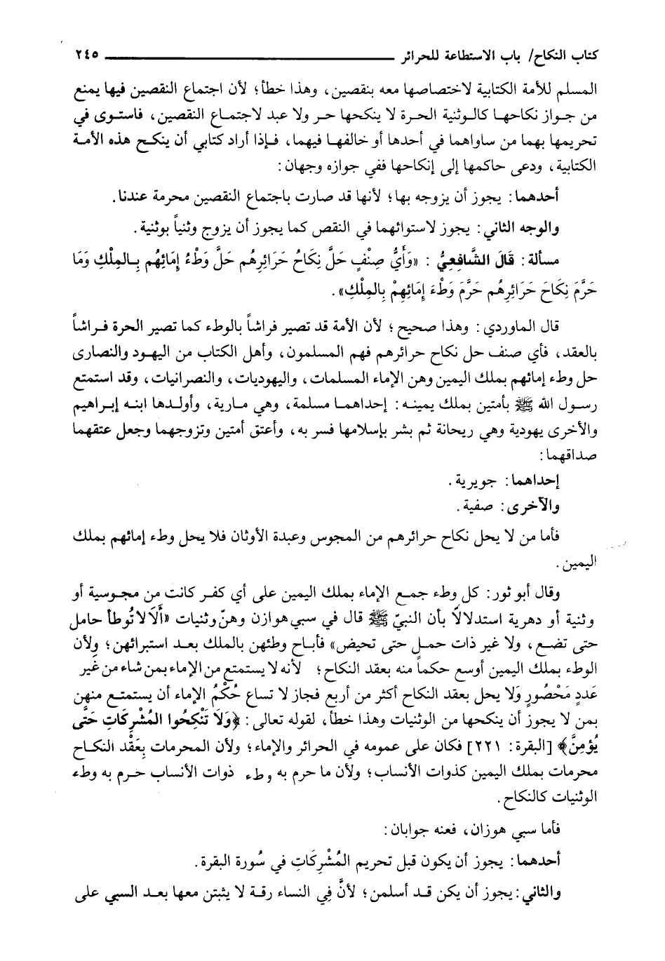 قَالَ الْمَاوَرْدِيُّ: وَهَذَا صَحِيحٌ؛ لِأَنَّ الْأَمَةَ قَدْ تَصِيرُ فِرَاشًا بِالْوَطْءِ كَمَا تَصِيرُ الْحُرَّةُ فِرَاشًا بالعقد، فأي صنف حل نكاح حرائرهم فهم الْمُسْلِمُونَ، وَأَهْلُ الْكِتَابِ مِنَ الْيَهُودِ وَالنَّصَارَى حَلَّ وَطْءُ إِمَائِهِمْ بِمِلْكِ الْيَمِينِ وَهُنَّ الْإِمَاءُ الْمُسْلِمَاتُ، واليهوديات، والنصرانيات، وقد اسْتَمْتَعَ رَسُولُ اللَّهِ - صَلَّى اللَّهُ عَلَيْهِ وَسَلَّم َ - بِأَمَتَيْنِ بِمِلْكِ يَمِينِهِ: إِحْدَاهُمَا مُسْلِمَةٌ، وَهِيَ مَارِيَةُ، وَأَوْلَدَهَا ابْنَهُ إِبْرَاهِيمَ وَالْأُخْرَى يَهُودِيَّةٌ وَهِيَ رَيْحَانَةُ ثُمَّ بُشِّرَ بِإِسْلَامِهَا فَسُّرَ بِهِ، وَأَعْتَقَ أَمَتَيْنِ وَتَزَوَّجَهُمَا وَجَعَلَ عِتْقَهُمَا صَدَاقَهُمَا: