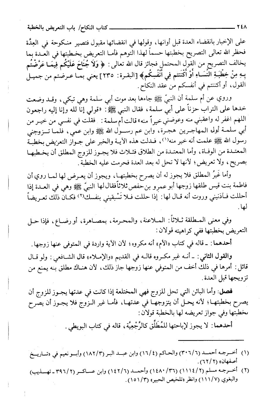 عَلَى الْإِخْبَارِ بِانْقِضَاءِ الْعِدَّةِ قَبْلَ أَوَانِهَا، وِقَوْلُهَا فِي انْقِضَائِهَا مَقْبُولٌ فَتَصِيرُ مَنْكُوحَةً فِي الْعِدَّةِ فَحَظَرَ اللَّهُ تَعَالَى التَّصْرِيحَ بِخِطْبَتِهَا حَسْمًا لِهَذَا التَّوَهُّمِ فَأَمَّا التَّعْرِيضُ بِخِطْبَتِهَا فِي الْعِدَّةِ بِمَا يُخَالِفُ التَّصْرِيحَ مِنَ الْقَوْلِ الْمُحْتَمَلِ فَجَائِزٌ قَالَ اللَّهُ تَعَالَى: {وَلاَ جُنَاحَ عَلَيْكُمْ فِيمَا عَرَّضْتُمْ بهِ مِنْ خِطْبَةِ النِّسَاءِ أَوْ أكْنَنْتُمْ فِي أنْفُسِكُمْ) {البقرة: 235) يَعْنِي بِمَا عَرَّضْتُمْ مِنْ جَمِيلِ الْقَوْلِ، أَوْ أَكْنَنْتُمْ فِي أَنْفُسِكُمْ مِنْ عَقْدِ النِّكَاحِ.