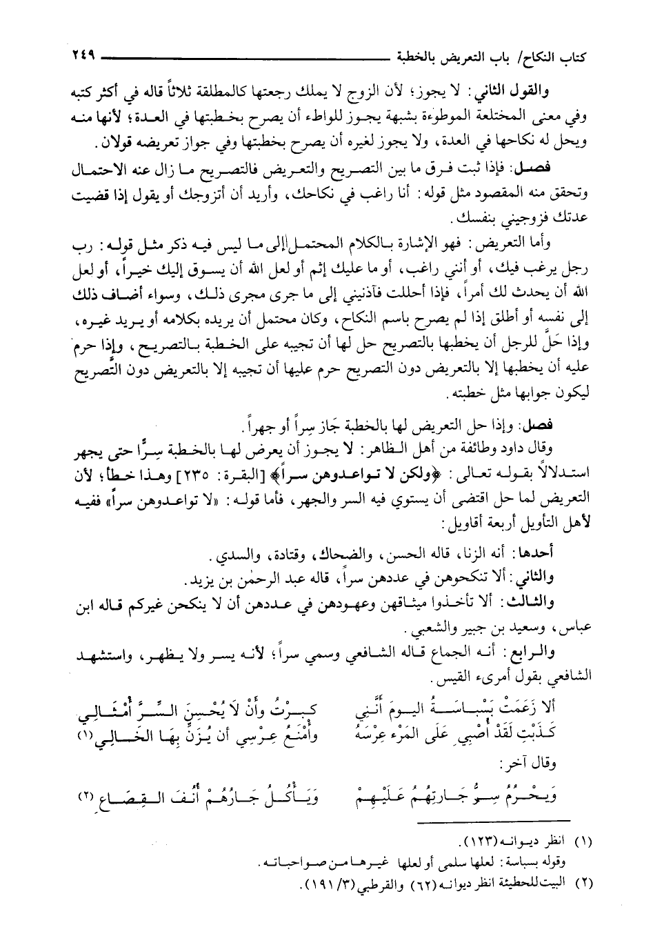وَقَالَ دَاوُدُ وَطَائِفَةٌ مِنْ أَهْلِ الظَّاهِرِ: لَا يَجُوزُ أَنْ يُعَرِّضَ لَهَا بِالْخِطْبَةِ سِرًّا حَتَّى يَجْهَرَ اسْتِدْلَالًا بِقَوْلِهِ تَعَالَى: {وَلَكِنْ لاَ تُوَاعِدُوهُنَّ سَراً) {البقرة: 235) وَهَذَا خَطَأٌ؛ لِأَنَّ التَّعْرِيضَ لَمَّا حَلَّ اقْتَضَى أَنْ يَسْتَوِيَ فِيهِ السِّرُّ وَالْجَهْرُ، فأما قوله: " لا تواعدوهن سراً " فَفِيهِ لِأَهْلِ التَّأْوِيلِ أَرْبَعَةُ أَقَاوِيلَ: