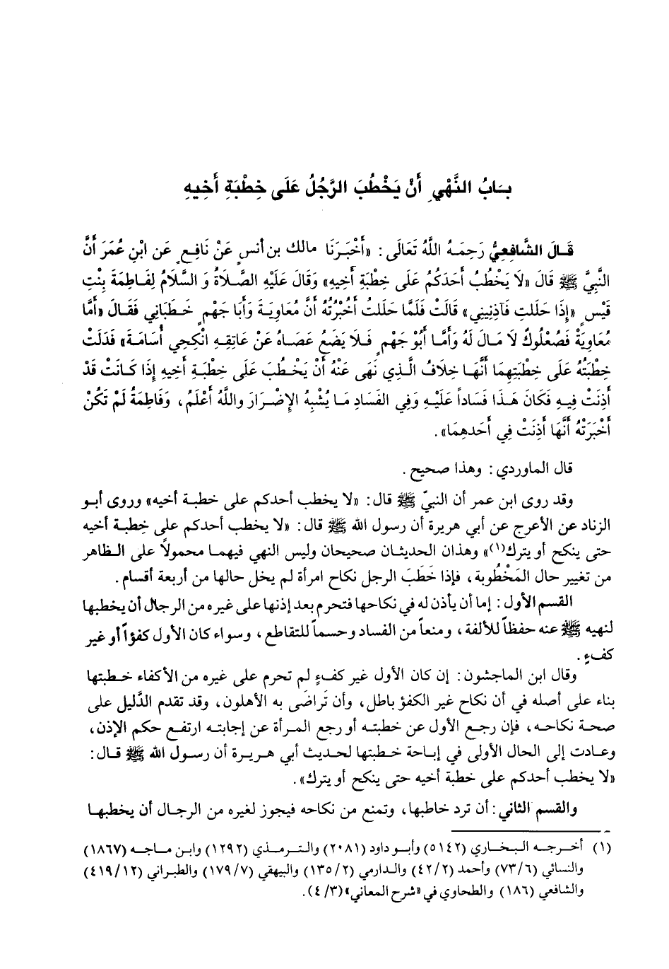 وقد رَوَى ابْنِ عُمَرَ أَنَّ النَّبِيَّ - صَلَّى اللَّهُ عَلَيْهِ وَسَلَّم َ - قَالَ: " لَا يَخْطُبُ أَحَدُكُمْ عَلَى خِطْبَةِ أَخِيهِ " وَرَوَى أَبُو الزِّنَادِ عَنِ الْأَعْرَجِ عَنْ أَبِي هُرَيْرَةَ أَنَّ رَسُولَ اللَّهِ - صَلَّى اللَّهُ عَلَيْهِ وَسَلَّم َ - قَالَ: " لَا يَخْطُبُ أَحَدُكُمْ عَلَى خِطْبَةِ أَخِيهِ حَتَّى يَنْكِحَ أَوْ يَتْرُكَ " وَهَذَانِ الْحَدِيثَانِ صَحِيحَانِ وَلَيْسَ النَّهْيُ فِيهِمَا مَحْمُولًا عَلَى الظَّاهِرِ مِنْ تغيير حال المخطوبة، فإذا خطب الرجل نكاح امْرَأَة لَمْ يَخْلُ حَالُهَا مِنْ أَرْبَعَةِ أَقْسَامٍ.