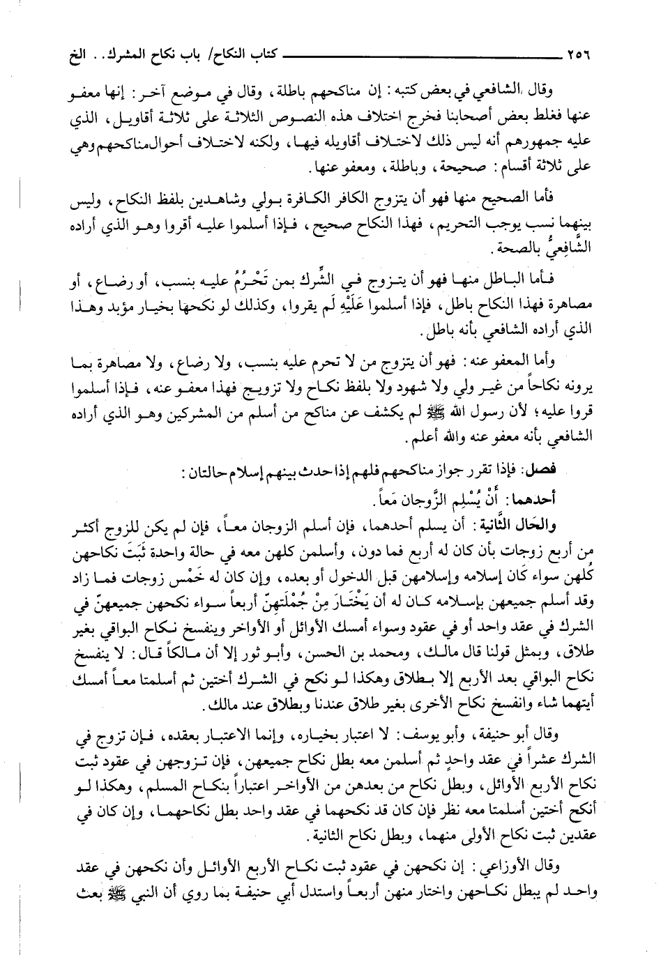 وقال الشافعي في بعض كتبه: إن مَنَاكِحهُمْ بَاطِلَةٌ، وَقَالَ فِي مَوْضِعٍ آخَرَ: إِنَّهَا مَعْفُوٌّ عَنْهَا فَغَلِطَ بَعْضُ أَصْحَابِنَا فَخَرَجَ اخْتِلَافُ هَذِهِ النُّصُوصِ الثَّلَاثَةِ عَلَى ثَلَاثَةِ أَقَاوِيلَ، الذي عليه جمهورهم أنه ليس ذلك لاختلاف أقاويله فيها، وَلَكِنَّهُ لِاخْتِلَافِ أَحْوَالِ مَنَاكِحِهِمْ وَهِيَ عَلَى ثَلَاثَةِ أَقْسَامٍ: صَحِيحَةٌ، وَبَاطِلَةٌ، وَمَعْفُوٌّ عَنْهَا.