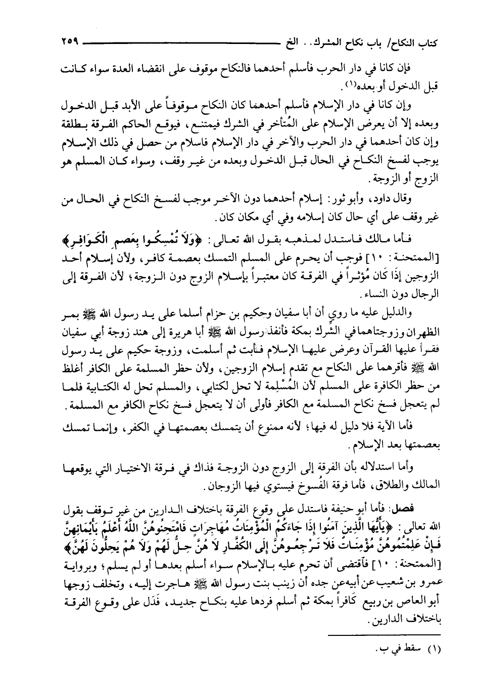 وَالدَّلِيلُ عَلَيْهِ مَا رُوِيَ أَنَّ أَبَا سُفْيَانَ وَحَكِيمَ بْنَ حِزَامٍ أَسْلَمَا عَلَى يَدِ رَسُولِ اللَّهِ - صَلَّى اللَّهُ عَلَيْهِ وَسَلَّم َ - بِمَرِّ الظَّهْرَانِ وَزَوْجَتَاهُمَا فِي الشِّرْكِ بِمَكَّةَ فَأَنْفَذَ رَسُولُ اللَّهِ - صَلَّى اللَّهُ عَلَيْهِ وَسَلَّم َ - أَبَا هُرَيْرَةَ إِلَى هِنْدٍ زَوْجَةِ أَبِي سُفْيَانَ فَقَرَأَ عَلَيْهَا الْقُرْآنَ وَعَرَضَ عَلَيْهَا الْإِسْلَامَ فَأَبَتْ ثم أسلمت، وزوجة حكيم عَلَى يَدِ رَسُولِ اللَّهِ - صَلَّى اللَّهُ عَلَيْهِ وَسَلَّم َ - فَأَقَرَّهُمَا عَلَى النِّكَاحِ مَعَ تَقَدُّمِ إِسْلَامِ الزَّوْجَيْنِ، وَلِأَنَّ حَظْرَ الْمُسْلَمَةِ عَلَى الْكَافِرِ أَغْلَظُ مِنْ حَظْرِ الْكَافِرَةِ عَلَى الْمُسْلِمِ لِأَنَّ الْمُسْلِمَةَ لَا تَحِلُّ لِكِتَابِيٍّ، وَالْمُسْلِمَ تَحِلُّ لَهُ الْكِتَابِيَّةُ فَلَمَّا لَمْ يَتَعَجَّلْ فَسْخُ نِكَاحِ الْمُسْلِمَةِ مَعَ الْكَافِرِ فَأَوْلَى أَنْ لَا يَتَعَجَّلَ فَسْخُ نِكَاحِ الْكَافِرِ مَعَ الْمُسْلِمَةِ.