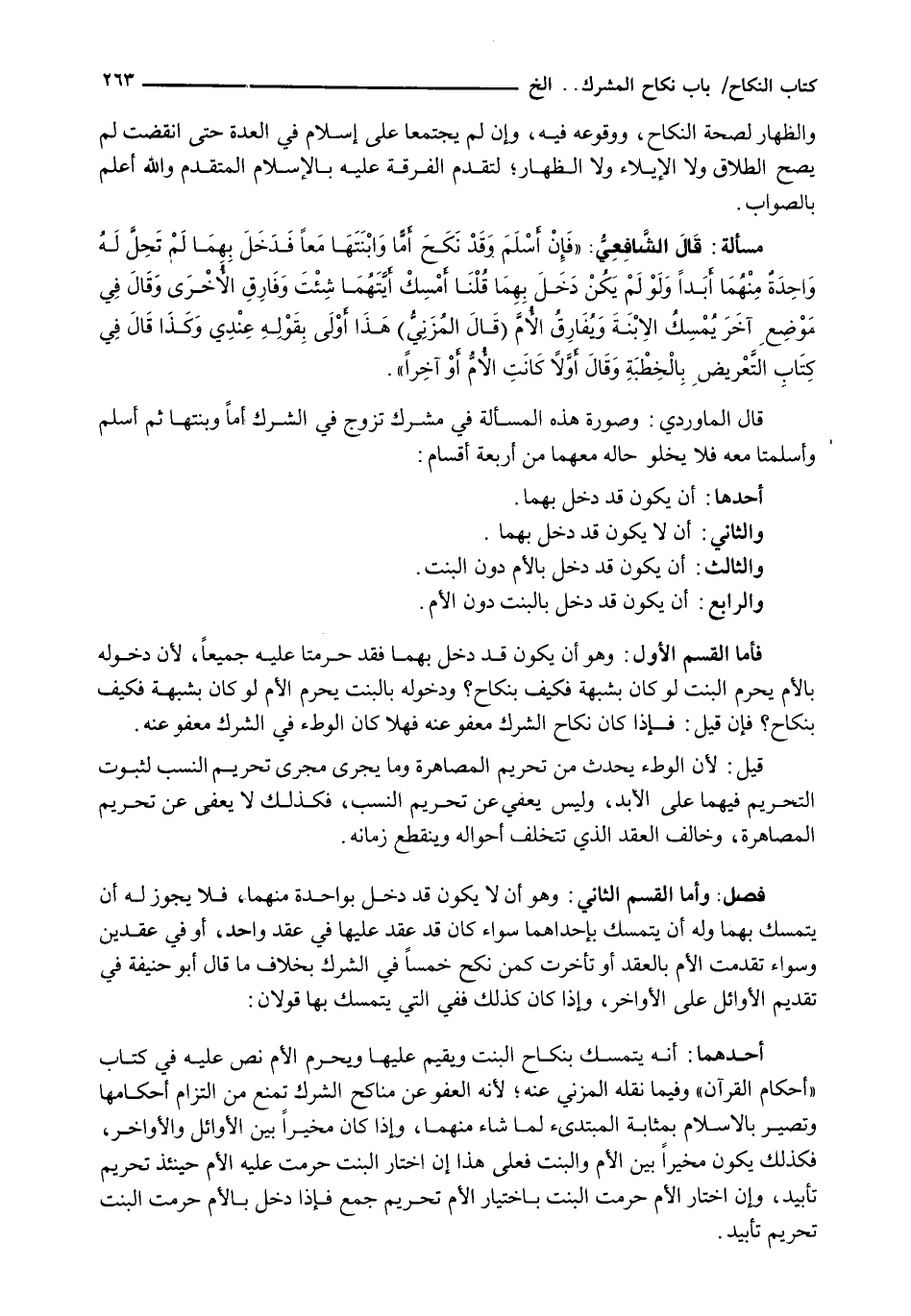 أَحَدُهُمَا: أَنَّهُ يَتَمَسَّكُ بِنِكَاحِ الْبِنْتِ وَيُقِيمُ عليها ويحرم الْأُمُّ نَصَّ عَلَيْهِ فِي كِتَابِ " أَحْكَامِ الْقُرْآنِ " وفيما نقله المزني عنه؛ لأنه العفو عن مناكح الشرك تمنع من التزام أحكامها وتصير بالإسلام بِمَثَابَةِ الْمُبْتَدِئِ لِمَا شَاءَ مِنْهُمَا، وَإِذَا كَانَ مُخَيَّرًا بَيْنَ الْأَوَائِلِ وَالْأَوَاخِرِ، فَكَذَلِكَ يَكُونُ مُخَيَّرًا بَيْنَ الْأُمِّ وَالْبِنْتِ فَعَلَى هَذَا إِنِ اخْتَارَ الْبِنْتَ حَرُمَتْ عَلَيْهِ الْأُمُّ حِينَئِذٍ تَحْرِيمَ تَأْبِيدٍ، وَإِنِ اخْتَارَ الْأُمَّ حَرُمَتِ الْبِنْتُ بِاخْتِيَارِ الْأُمِّ تَحْرِيمَ جَمْعٍ فَإِذَا دَخَلَ بِالْأُمِّ حَرُمَتِ الْبِنْتُ تحريم تأبيد.