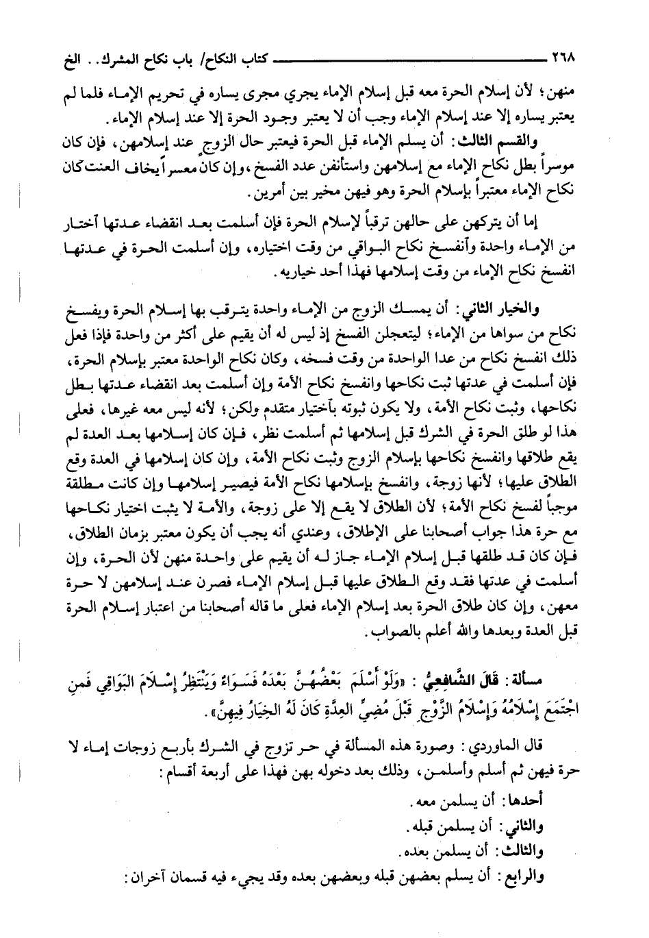 قَالَ الْمَاوَرْدِيُّ: وَصُورَةُ هَذِهِ الْمَسْأَلَةِ فِي حُرٍّ تَزَوَّجَ فِي الشِّرْكِ بِأَرْبَعِ زَوْجَاتٍ إِمَاءً لَا حُرَّةَ فِيهِنَّ ثُمَّ أَسْلَمَ وَأَسْلَمْنَ، وَذَلِكَ بَعْدَ دُخُولِهِ بِهِنَّ فَهَذَا عَلَى أَرْبَعَةِ أَقْسَامٍ: