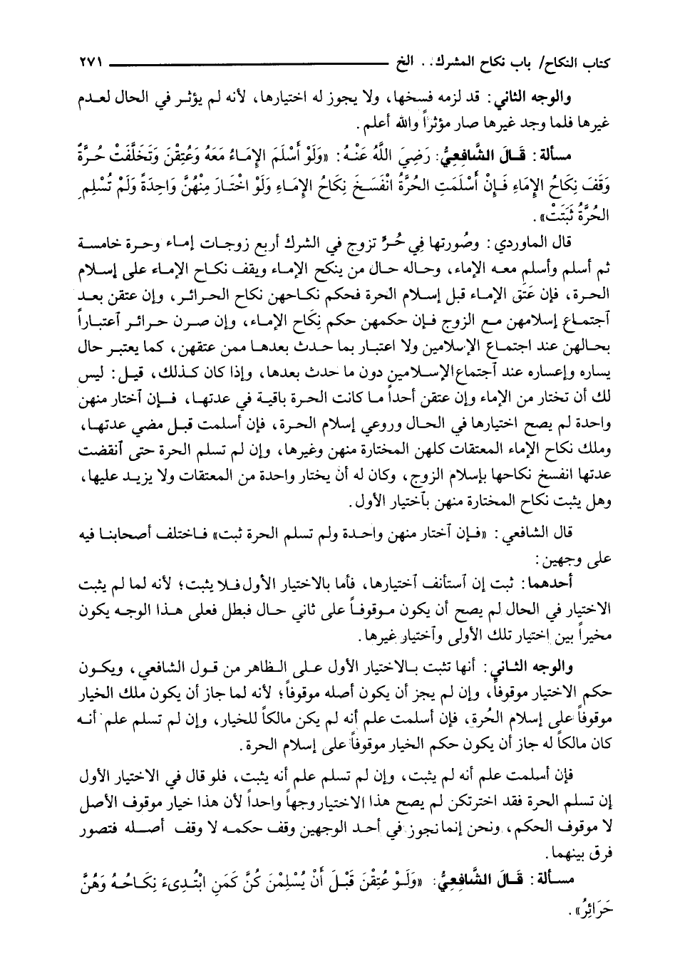قَالَ الْمَاوَرْدِيُّ: وَصُورَتُهَا فِي حُرٍّ تَزَوَّجَ فِي الشرك أربع زوجات إماء وحرة خَامِسَة ثُمَّ أَسْلَمَ وَأَسْلَمَ مَعَهُ الْإِمَاءُ، وَحَالُهُ حال من ينكح الإماء ويقف نِكَاحُ الْإِمَاءِ عَلَى إِسْلَامِ الْحُرَّةِ، فَإِنْ عَتَقَ الْإِمَاءُ قَبْلَ إِسْلَامِ الْحُرَّةِ فَحُكْمُ نِكَاحِهِنَّ نِكَاحُ الْحَرَائِرِ، وَإِنْ عَتَقْنَ بَعْدَ اجْتِمَاعِ إِسْلَامِهِنَّ مَعَ الزَّوْجِ فَإِنَّ حُكْمَهُنَّ حُكْمُ نِكَاحِ الْإِمَاءِ، وَإِنْ صِرْنَ حَرَائِرَ اعْتِبَارًا بِحَالِهِنَّ عِنْدَ اجْتِمَاعِ الْإِسْلَامَيْنِ ولا اعتبار بما حدث بعدها ممن عتقهنَّ، كَمَا يُعْتَبَرُ حَالُ يَسَارِهِ وَإِعْسَارِهِ عِنْدَ اجْتِمَاعِ الْإِسْلَامَيْنِ دُونَ مَا حَدَثَ بَعْدَهَا، وَإِذَا كَانَ كَذَلِكَ، قِيلَ: لَيْسَ لَكَ أَنْ تَخْتَارَ مِنَ الْإِمَاءِ وَإِنْ عَتَقْنَ أَحَدًا مَا كَانَتِ الْحُرَّةُ بَاقِيَةً فِي عِدَّتِهَا، فَإِنِ اخْتَارَ مِنْهُنَّ واحدة لَمْ يَصِحَّ اخْتِيَارُهَا فِي الْحَالِ وَرُوعِيَ إِسْلَامُ الْحُرَّةِ، فَإِنْ أَسْلَمَتْ قَبْلَ مُضِيِّ عِدَّتِهَا، وَمَلَكَ نِكَاحَ الْإِمَاءِ الْمُعْتَقَاتِ كُلِّهِنَّ الْمُخْتَارَةُ مِنْهُنَّ وَغَيْرُهَا، وَإِنْ لَمْ تُسْلِمِ الْحُرَّةُ حَتَّى انْقَضَتْ عِدَّتُهَا انْفَسَخَ نِكَاحُهَا بِإِسْلَامِ الزَّوْجِ، وَكَانَ لَهُ أَنْ يختار واحدة من المعتقان وَلَا يَزِيدَ عَلَيْهَا، وَهَلْ يَثْبُتُ نِكَاحُ الْمُخْتَارَةِ مِنْهُنَّ بِاخْتِيَارِ الْأَوَّلِ.