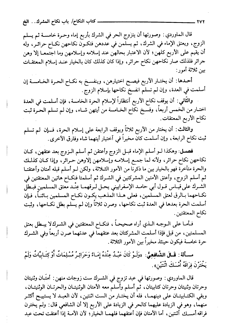 قَالَ الْمَاوَرْدِيُّ: وَصُورَتُهَا أَنْ يَتَزَوَّجَ الْحُرُّ فِي الشِّرْكِ بِأَرْبَعِ إِمَاءٍ وَحُرَّةٍ خَامِسَةٍ ثُمَّ يُسْلِمِ الزَّوْجُ، وَيَعْتَقُ الْإِمَاءُ فِي الشِّرْكِ، ثُمَّ يُسْلِمْنَ في عددهن فتكون نكاحهن نكاح حرائر، وله أن يقيم على الأربع كلهن؛ لِأَنَّ الِاعْتِبَارَ بِحَالِهِنَّ عِنْدَ إِسْلَامِهِ وَإِسْلَامِهِنَّ وَمَا اجْتَمَعَا إِلَّا وَهُنَّ حَرَائِرُ فَلِذَلِكَ صَارَ نِكَاحُهُنَّ نِكَاحَ حَرَائِرَ، وَإِذَا كَانَ كَذَلِكَ كَانَ بِالْخِيَارِ عند إسلام المعتقات بين ثَلَاثَةِ أُمُورٍ: