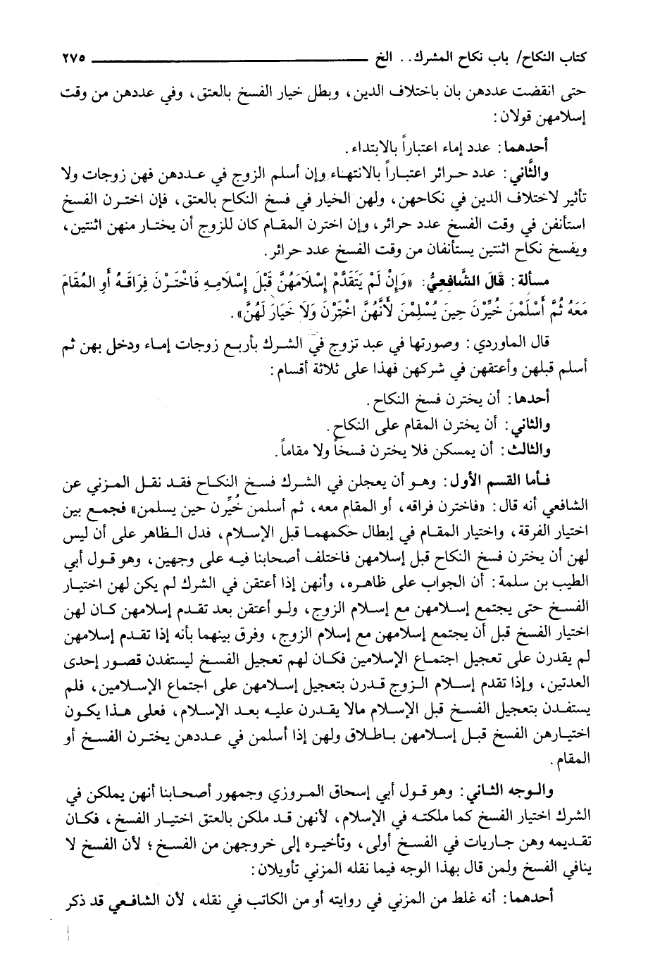 فَأَمَّا الْقِسْمُ الْأَوَّلُ: وَهُوَ أَنْ يُعَجِّلْنَ فِي الشِّرْكِ فَسْخَ النِّكَاحِ فَقَدْ نَقَلَ الْمُزَنِيُّ عَنِ الشَّافِعِيِّ أَنَّهُ قَالَ: " فَاخْتَرْنَ فِرَاقَهُ، أَوِ الْمُقَامَ مَعَهُ، ثُمَّ أَسْلَمْنَ خُيِّرْنَ حِينَ يُسْلِمْنَ " فَجَمَعَ بَيْنَ اخْتِيَارِ الْفُرْقَةِ، وَاخْتِيَارِ الْمُقَامِ فِي إِبْطَالِ حُكْمِهِمَا قَبْلَ الْإِسْلَامِ، فَدَلَّ الظَّاهِرُ عَلَى أَنْ لَيْسَ لَهُنَّ أَنْ يَخْتَرْنَ فَسْخَ النِّكَاحِ قَبْلَ إِسْلَامِهِنَّ فَاخْتَلَفَ أَصْحَابُنَا فيه على وجهين، وَهُوَ قَوْلُ أَبِي الطَّيِّبِ بْنِ سَلَمَةَ: أَنَّ الجواب على ظاهره، وأنهن إذا أعتقن فِي الشِّرْكِ لَمْ يَكُنْ لَهُنَّ اخْتِيَارُ الْفَسْخِ حتى يَجْتَمِعَ إِسْلَامُهُنَّ مَعَ إِسْلَامِ الزَّوْجِ، وَفَرَّقَ بَيْنَهُمَا بِأَنَّهُ إِذَا تَقَدَّمَ إِسْلَامُهُنَّ لَمْ يَقْدِرْنَ عَلَى تَعْجِيلِ اجْتِمَاعِ الْإِسْلَامَيْنِ فَكَانَ لَهُمْ تَعْجِيلُ الْفَسْخِ لِيَسْتَفِدْنَ قُصُورَ إِحْدَى الْعِدَّتَيْنِ، وَإِذَا تَقَدَّمَ إِسْلَامُ الزَّوْجِ قَدَرْنَ بِتَعْجِيلِ إِسْلَامِهِنَّ عَلَى اجْتِمَاعِ الْإِسْلَامَيْنِ، فَلَمْ يَسْتَفِدْنَ بِتَعْجِيلِ الْفَسْخِ قَبْلَ الْإِسْلَامِ مَا لَا يَقْدِرْنَ عَلَيْهِ بَعْدَ الْإِسْلَامِ، فَعَلَى هَذَا يكون اختيارهن الفسخ قبل إسلامهن بالطلاق ولهن إذا أسلمن في عددهن يَخْتَرْنَ الْفَسْخَ أَوِ الْمُقَامَ.