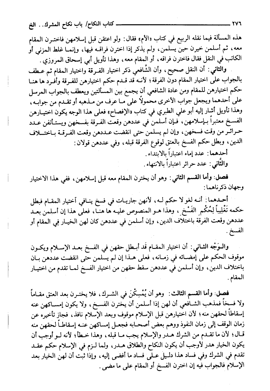 وَالثَّانِي: أَنَّ النَّقْلَ صَحِيحٌ، وَأَنَّ الشَّافِعِيَّ ذَكَرَ اخْتِيَارَ الْفُرْقَةِ وَاخْتِيَارَ الْمُقَامِ ثُمَّ عَطَفَ بِالْجَوَابِ عَلَى اخْتِيَارِ الْمُقَامِ دُونَ الْفُرْقَةِ؛ لِأَنَّهُ قَدْ قَدَّمَ حُكْمَ اخْتِيَارِهِنَّ لِلْفُرْقَةِ وَأَفْرَدَ هَاهُنَا حُكْمَ اخْتِيَارِهِنَّ لِلْمُقَامِ وَمِنْ عَادَةِ الشَّافِعِيِّ أَنْ يَجْمَعَ بَيْنَ الْمَسْأَلَتَيْنِ وَيَعْطِفَ بِالْجَوَابِ المرسل على أحدهما وَيَجْعَلَ جَوَابَ الْأُخْرَى مَحْمُولًا عَلَى مَا عُرِفَ من مذهبه أو تقدم من جوابه، وهذا تَأْوِيلٌ أَشَارَ إِلَيْهِ أَبُو عَلِيٍّ الطَّبَرِيُّ فِي كِتَابِ " الْإِفْصَاحِ " فَعَلَى هَذَا الْوَجْهِ يَكُونُ اخْتِيَارُهُنَّ الْفَسْخَ مُعْتَبَرًا بِإِسْلَامِهِنَّ، فَإِنْ أَسْلَمْنَ فِي عِدَدِهِنَّ وَقَعَتِ الْفُرْقَةُ بِفَسْخِهِنَّ وَيَسْتَأْنِفْنَ عِدَدَ حَرَائِرَ مِنْ وَقْتِ فَسْخِهِنَّ، وَإِنْ لَمْ يُسْلِمْنَ حَتَّى انْقَضَتْ عِدَدُهُنَّ وَقَعَتِ الْفُرْقَةُ بِاخْتِلَافِ الدِّينِ، وَبَطَلَ حُكْمُ الْفَسْخِ بِالْعِتْقِ لِوُقُوعِ الْفُرْقَةِ قَبْلَهُ، وَفِي عِدَدِهِنَّ قَوْلَانِ: